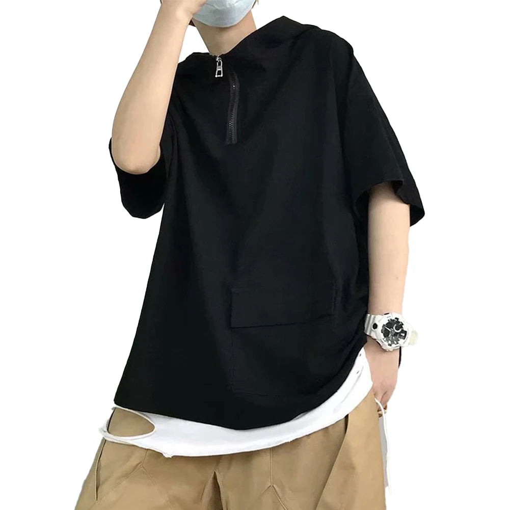 HEARUJOY - Pullover Men Tops Hoodie Loose Pocket Polyester Casual Harajuku Hip Hop Hooded Short Sleeve Solid Color Sweatshirt