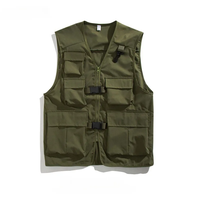 HEARUJOY - Pure Color V Neck Multi Pocket Utility Vest Men Trendy High Street Sporty Unisex Loose Sleeveless Jacket Functional Casual