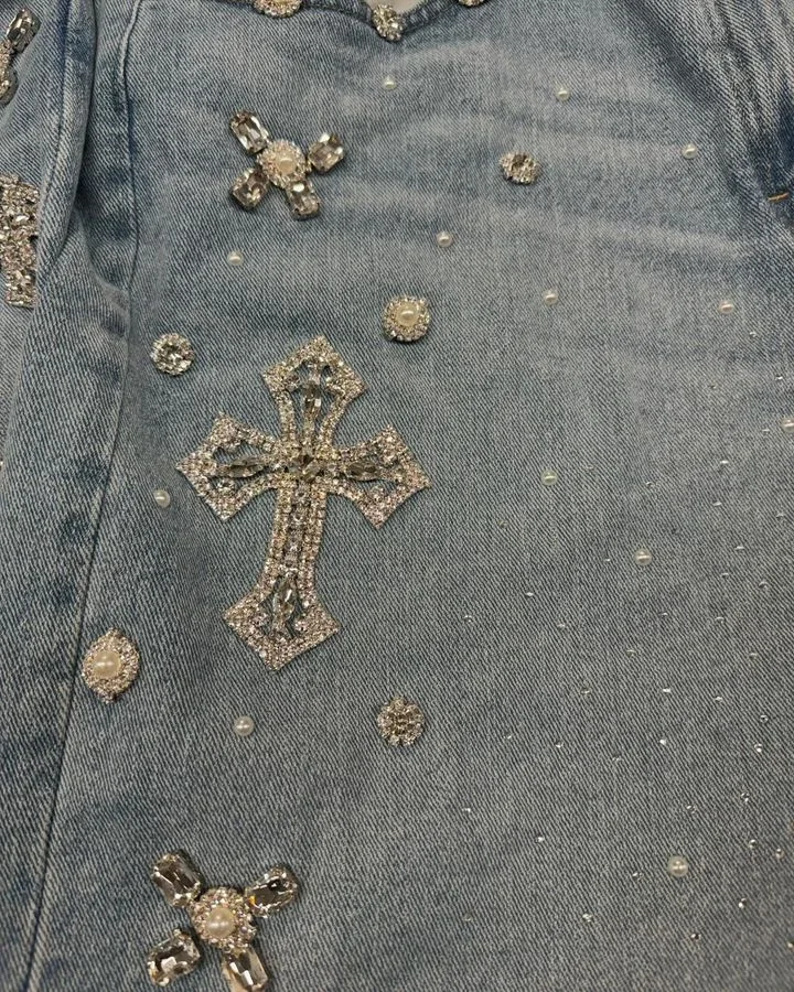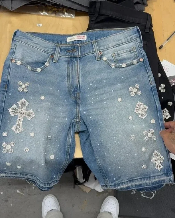 Hearujoy Retro Blue Streetwear Y2K Gothic Shorts Hip Hop Rhinestones Baggy Jeans Denim Gym Shorts Men Women High Waist Basketball Shorts