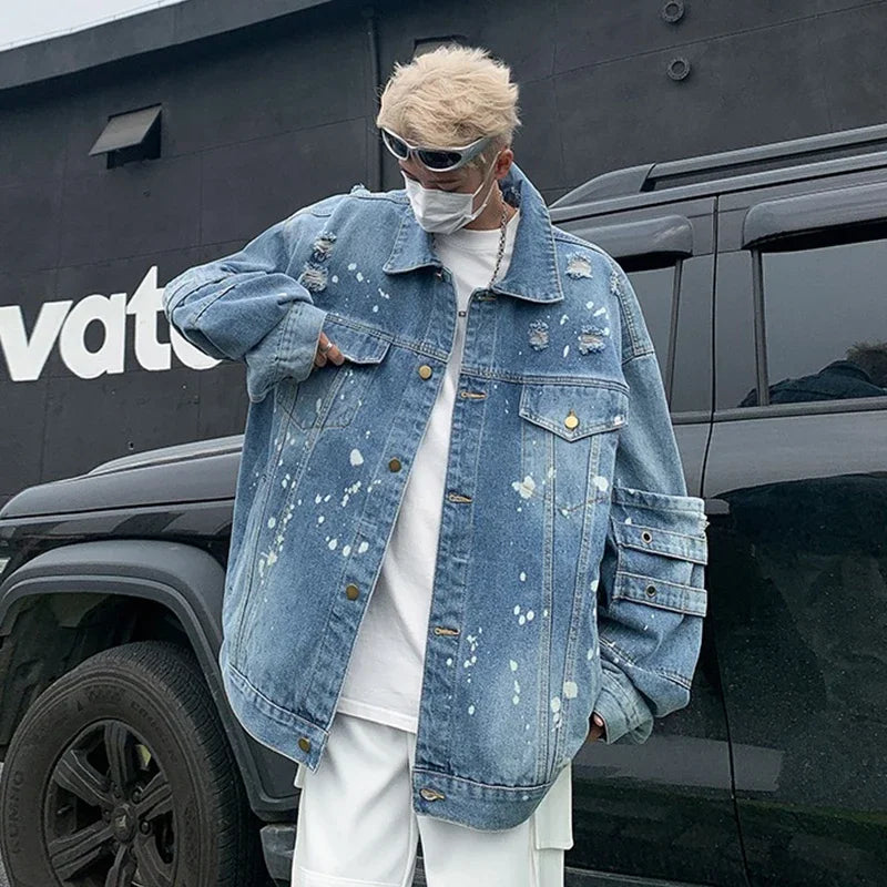 Hearujoy Retro Heavyweight Splashed Ink Ripped Denim Jacket Unisex Loose High-end Turn Down Collar Coat Washed Gradient Workwear Jacket