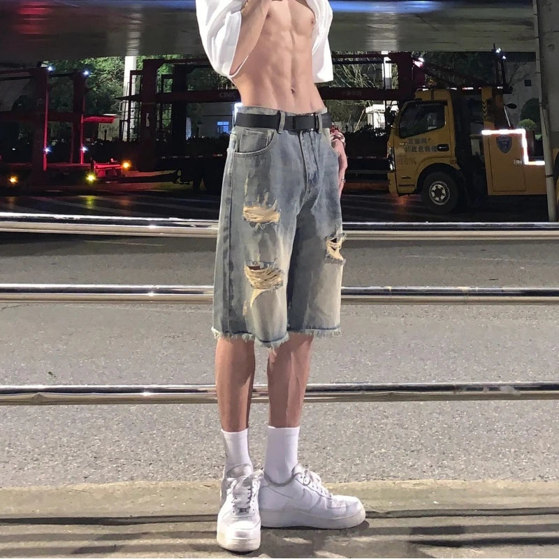 HEARUJOY - Retro High Street Versatile Five-point Men's Wide-leg Ripped Denim Shorts
