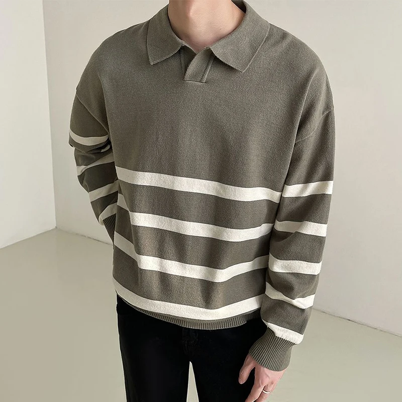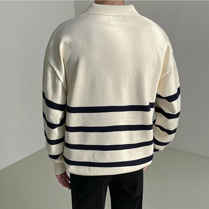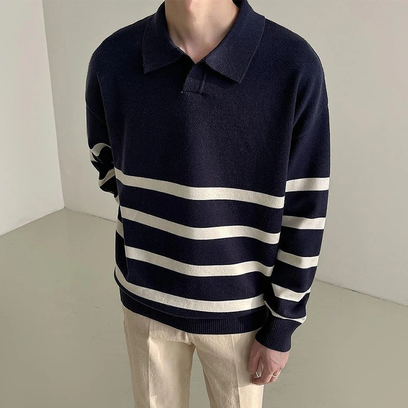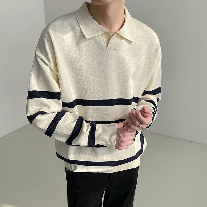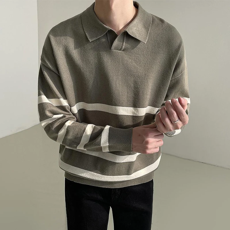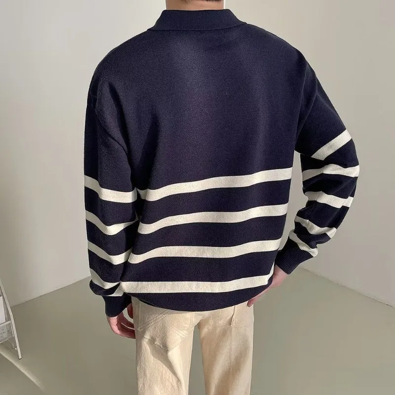 Hearujoy Shoulder Drop Striped Lapel Sweater Men's Light Luxury Outerwear Knitted Sweater Long Sleeved Casual Temperament Line Garment