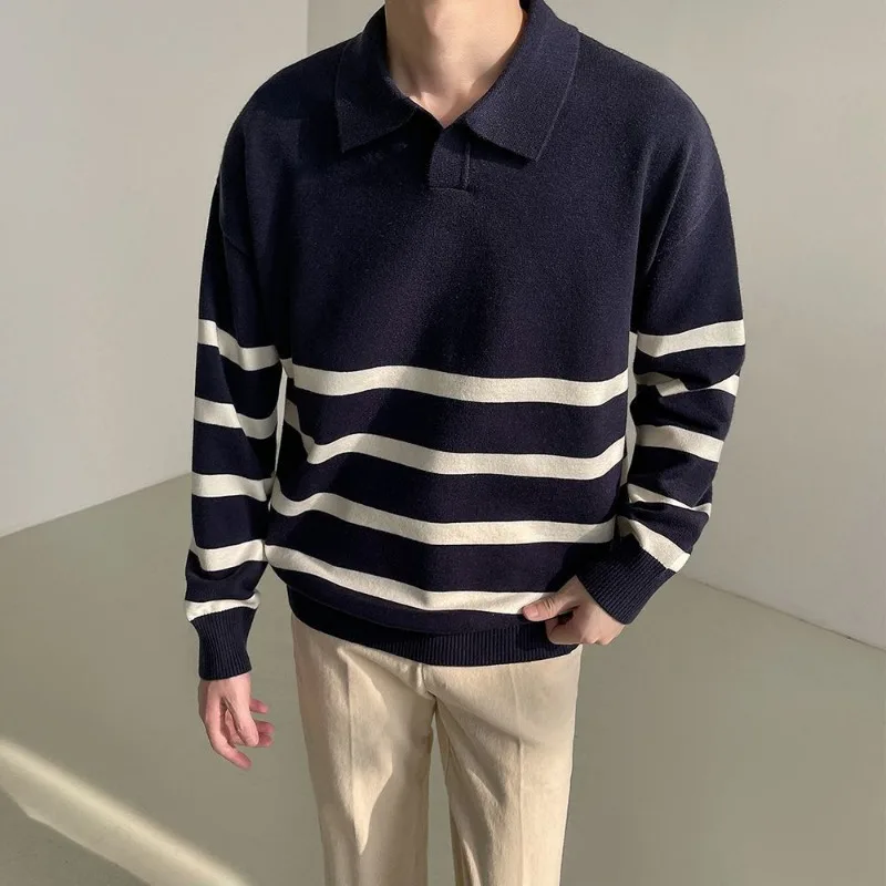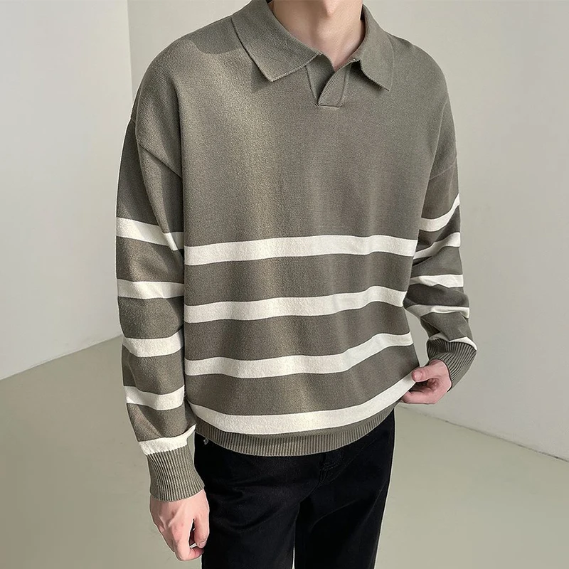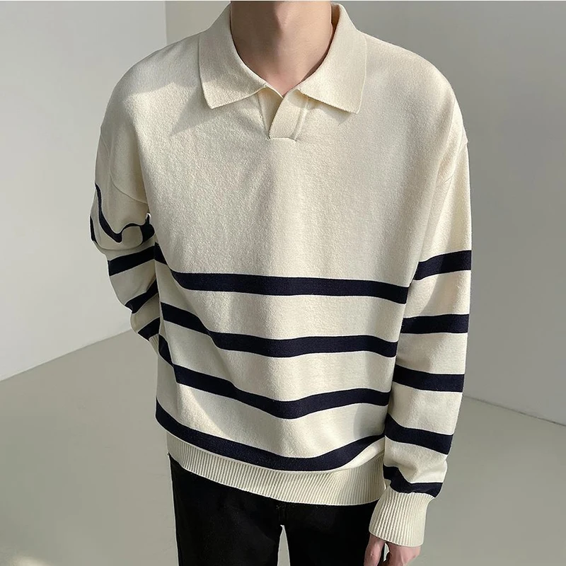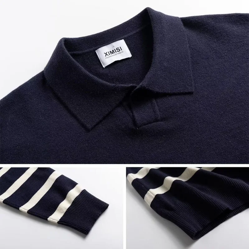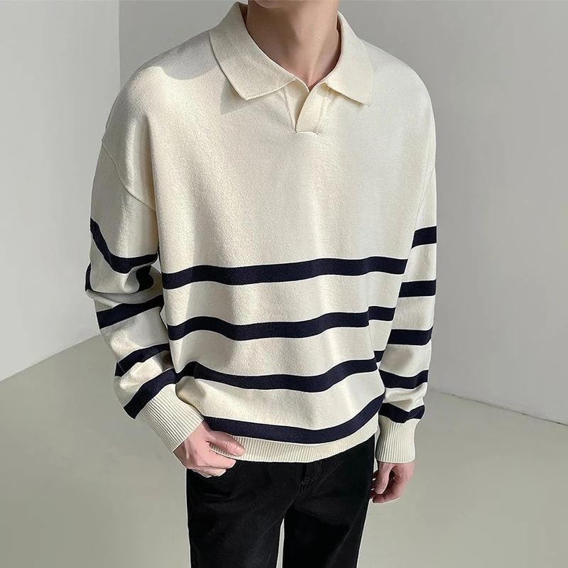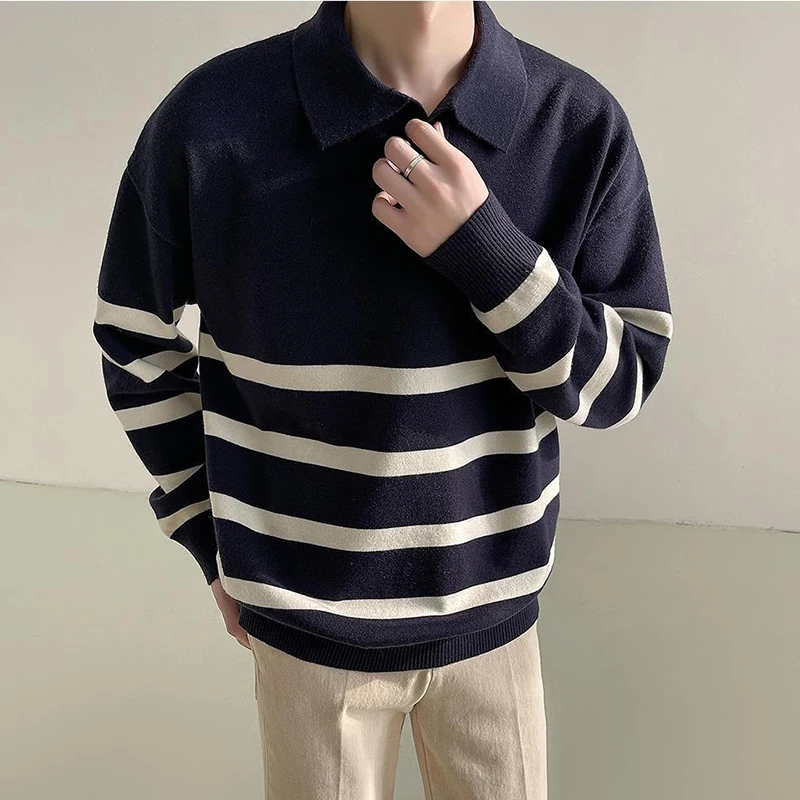 Hearujoy Shoulder Drop Striped Lapel Sweater Men's Light Luxury Outerwear Knitted Sweater Long Sleeved Casual Temperament Line Garment