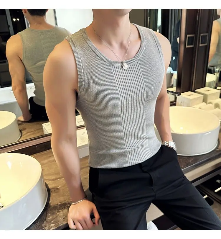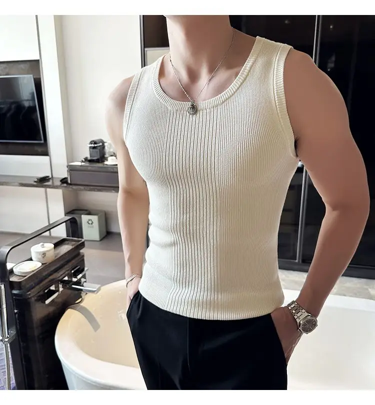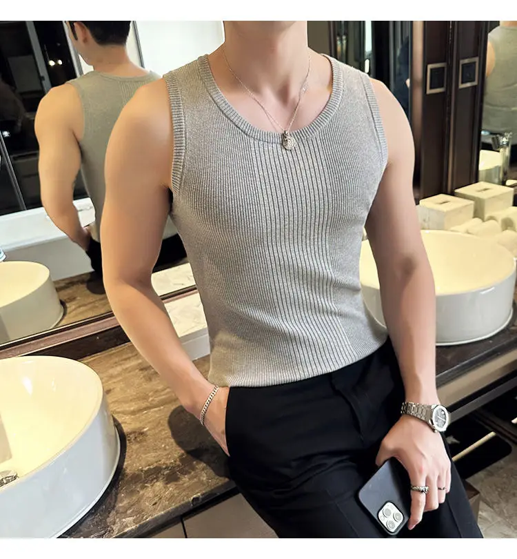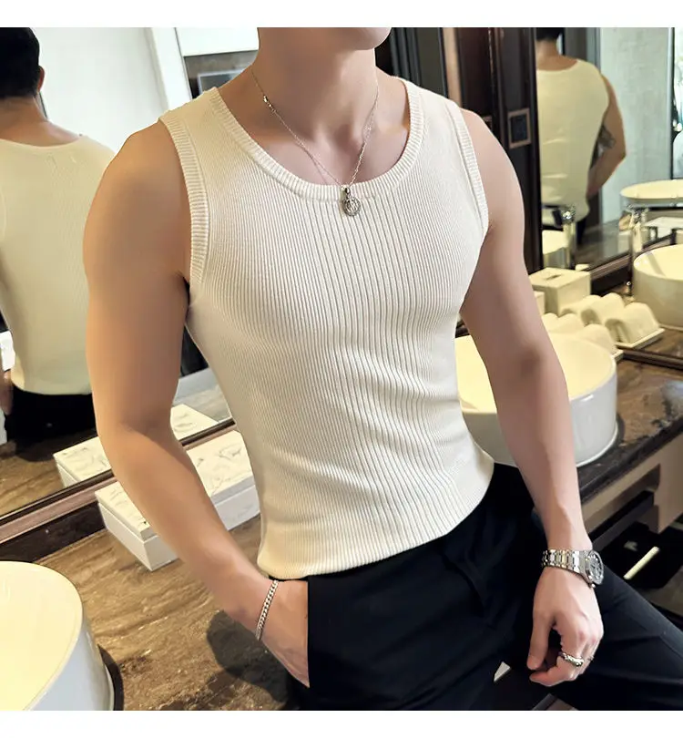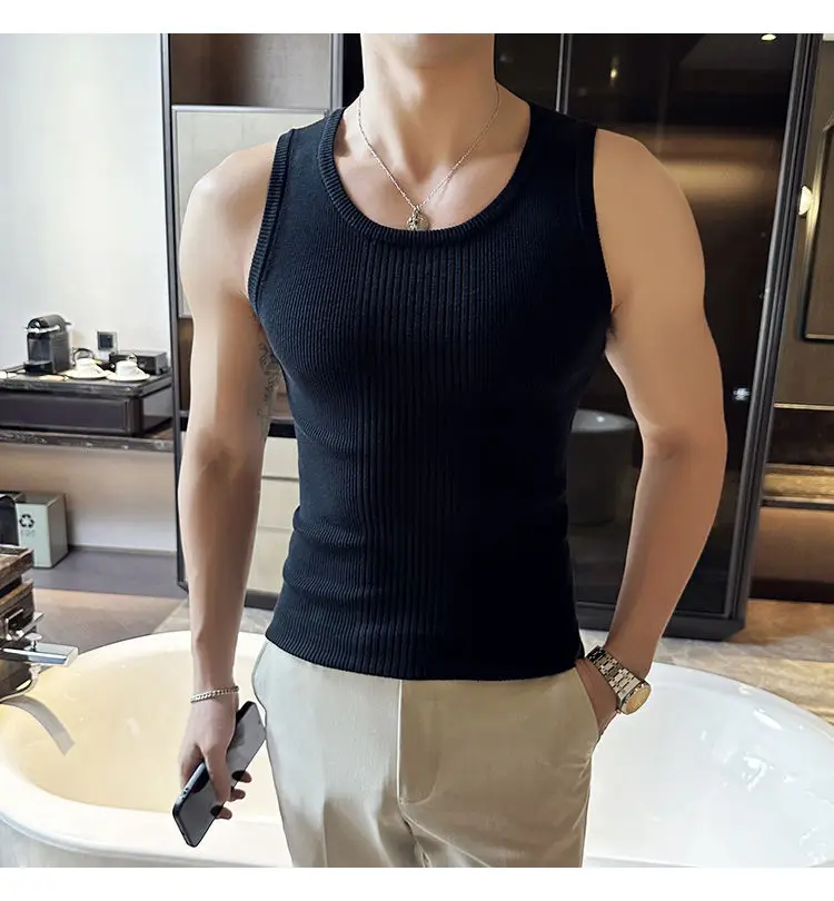 HEARUJOY - Solid Color Sleeveless Round Neck Summer Men Casual American Style Handsome Knitting Vest Bodybuilding Elastic Force Slim Tops