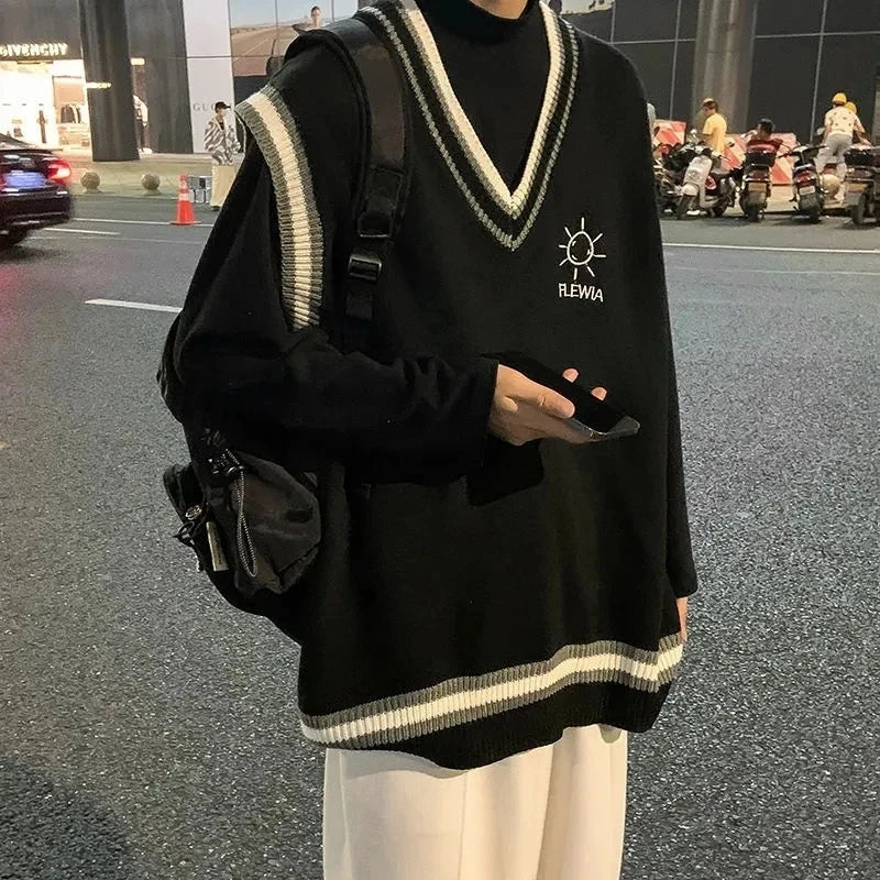 Hearujoy Spring Autumn Fashion Solid Casual Pullover Tess Vest Men Loose Knitted Top Student Preppy Style Sweater Gentle Print Patchwork