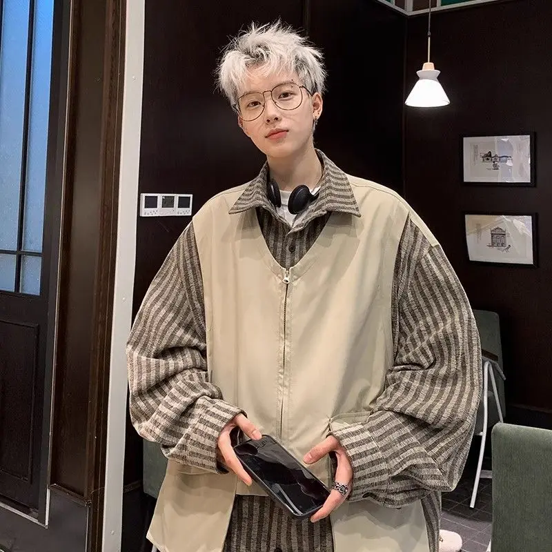 Hearujoy Spring Autumn Handsome Blouse Casual Long Sleeve Jacket Fake Two Piece Shirt for Men 2024 New Hip Hop Streetwear Striped Shirt
