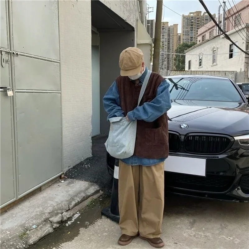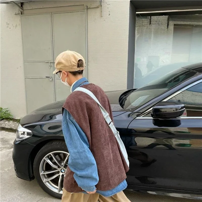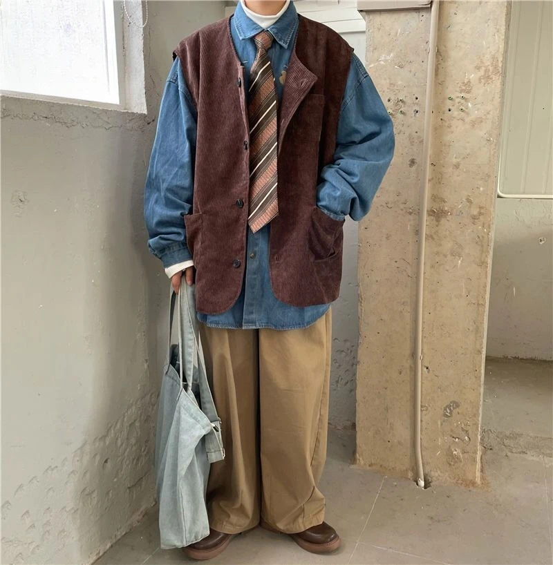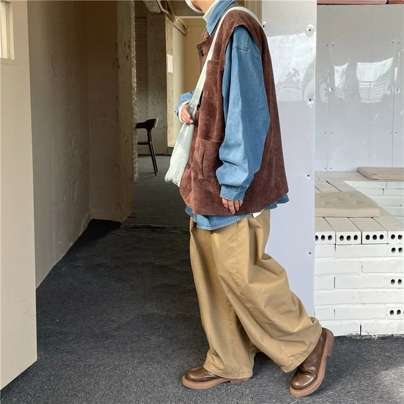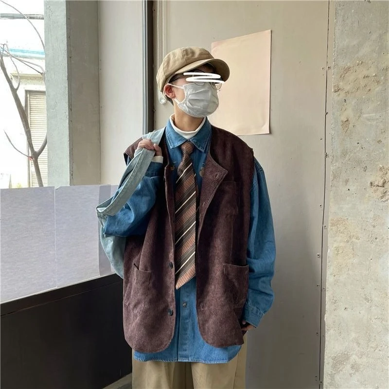 HEARUJOY - Spring Autumn Retro Japanese Corduroy Vest for Men Collarless Versatile Casual Jacket Trendy Layering Outerwear