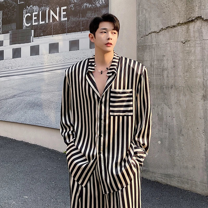 Hearujoy spring summer fashion trend stripe contrast color satin shoulder pad shirt men's suit straight wide leg pants two-piece set