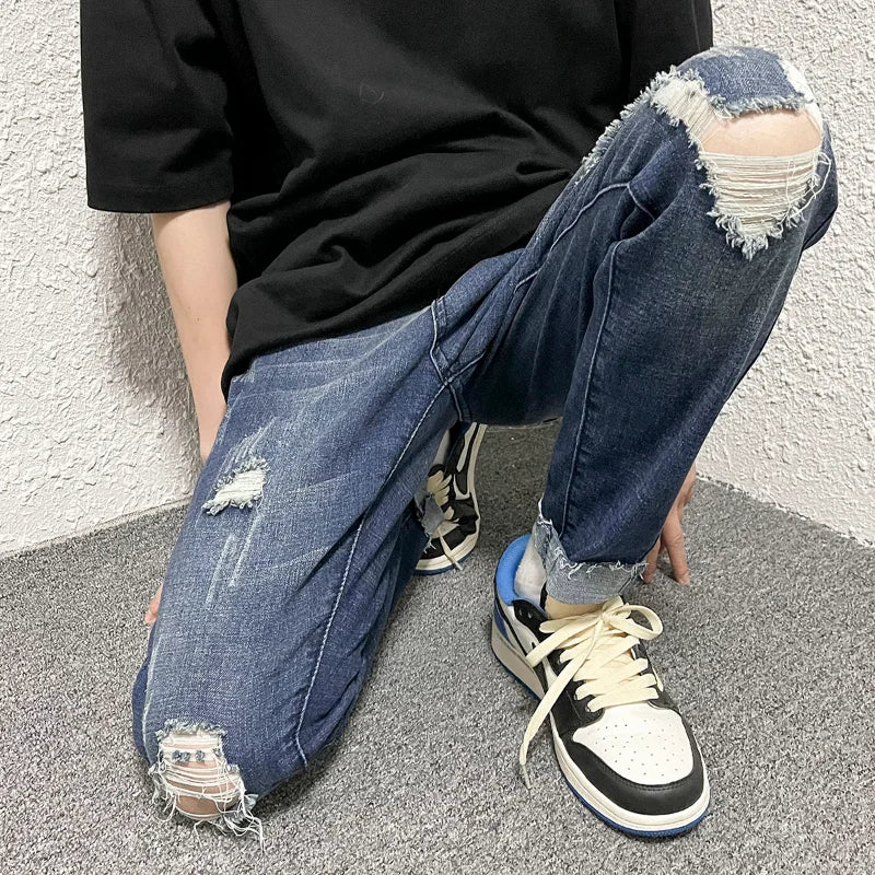 Hearujoy Spring/Summer Loose Jeans Men's Straight Vintage Broken Jeans Street Boys Hip-hop Slim Fit Cropped Pants Light Blue