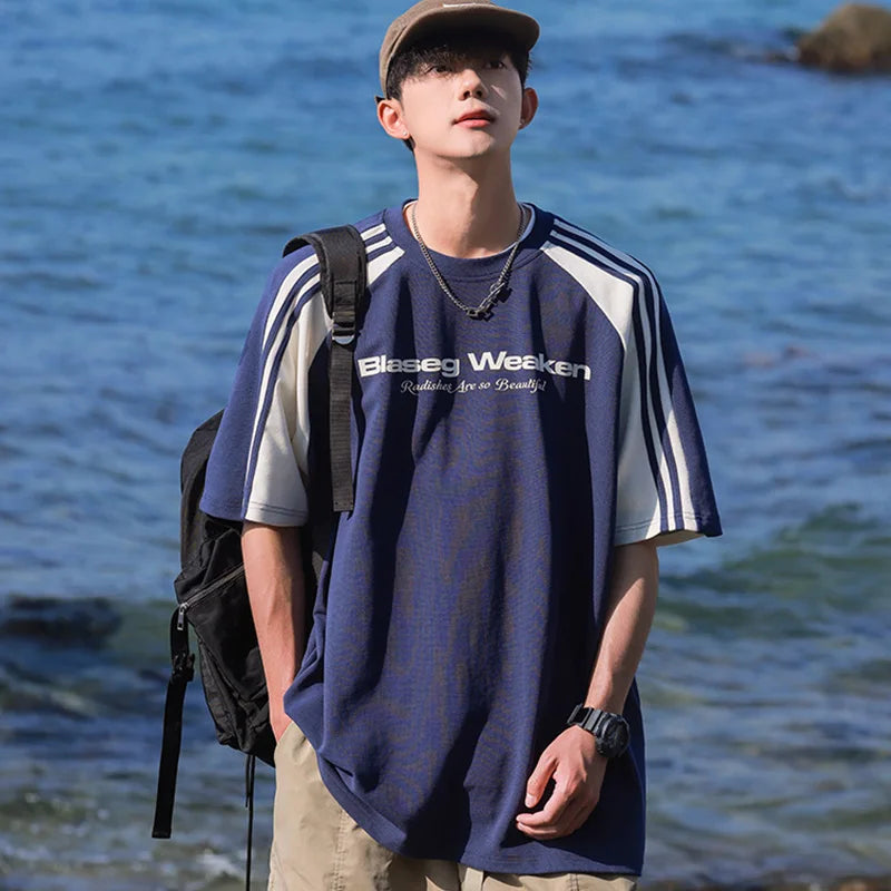 HEARUJOY - Streetwear Men Patchwork Striped Design T-shirt Unisex New in Summer Loose Fit American Vintage Casual Round Neck TopsTees