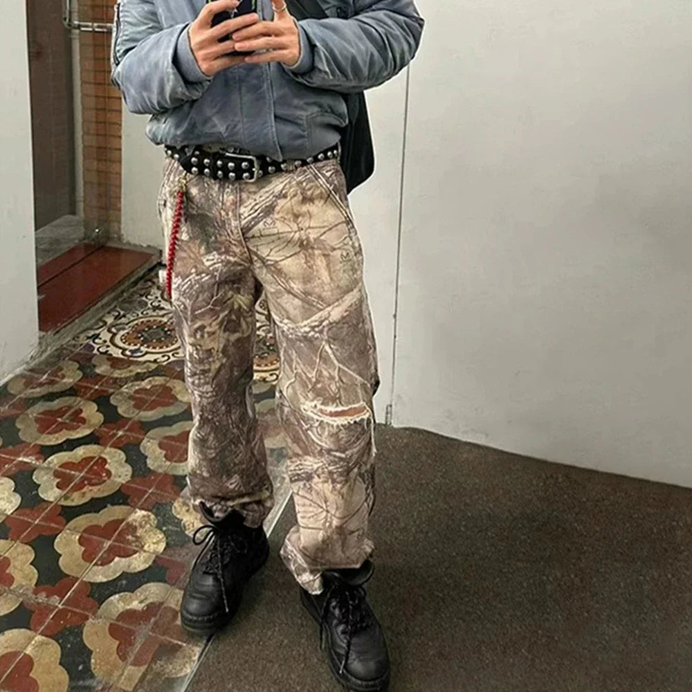 Hearujoy Streetwear Trees Print Camouflage Baggy Jeans for Men and Women Patchwork Washed Casual Denim Trouses Oversized Loose Cargos