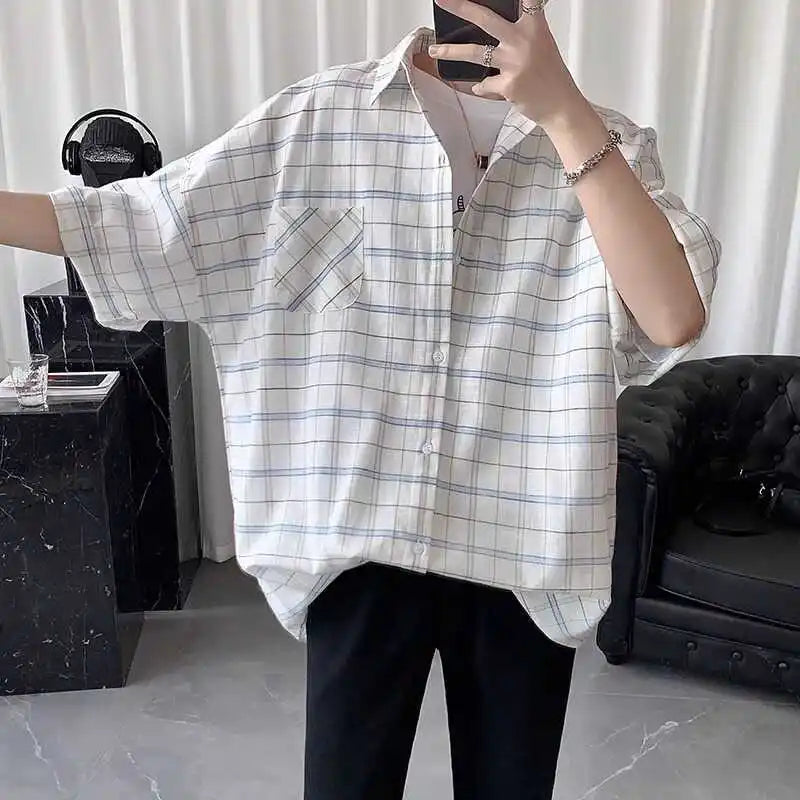 HEARUJOY - Striped Plaid Short-sleeved Shirt for Men Loose and Versatile Casual and Daily Tops