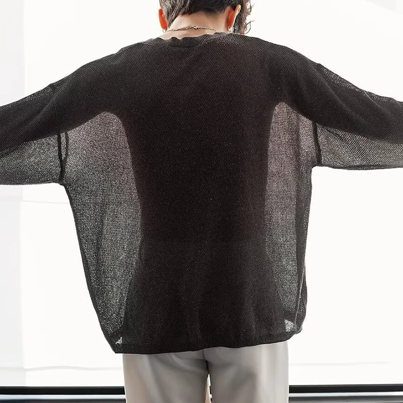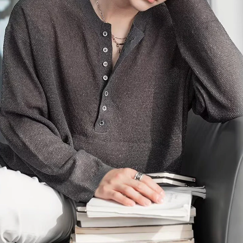 HEARUJOY - Stylish Knitted Henley T Shirts Mens Trendy Long Sleeve Button Hollow Out Knit T-shirt Spring Autumn Casual Men's Knitting Tops