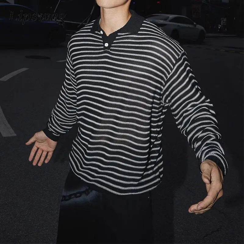 HEARUJOY - Stylish Striped Textured Polo Shirts Mens Vintage Hollow Out Knitted Tops Men Spring Autumn Casual Breathable Knitting Pullover
