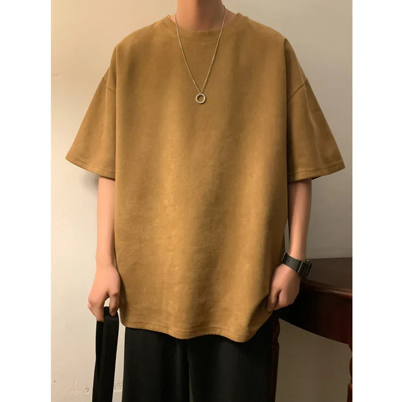 Hearujoy Suede T-shirt Men Oversized Fashion Solid Color Retro T Shirt Men Streetwear Summer Loose Short Sleeved T-shirt Mens Top M-3XL
