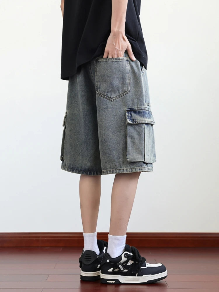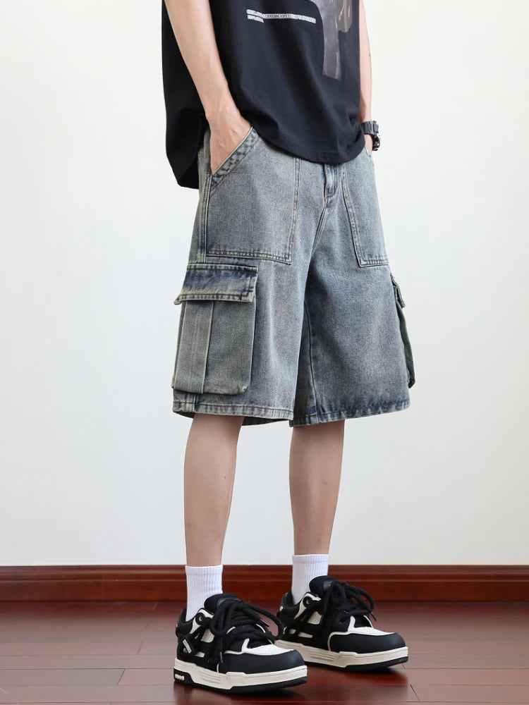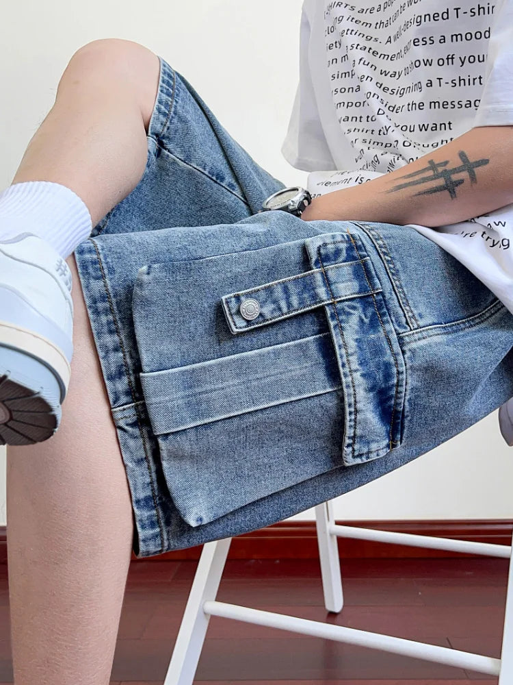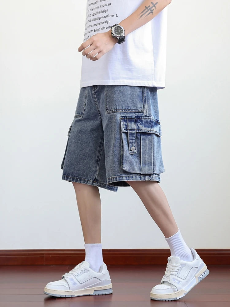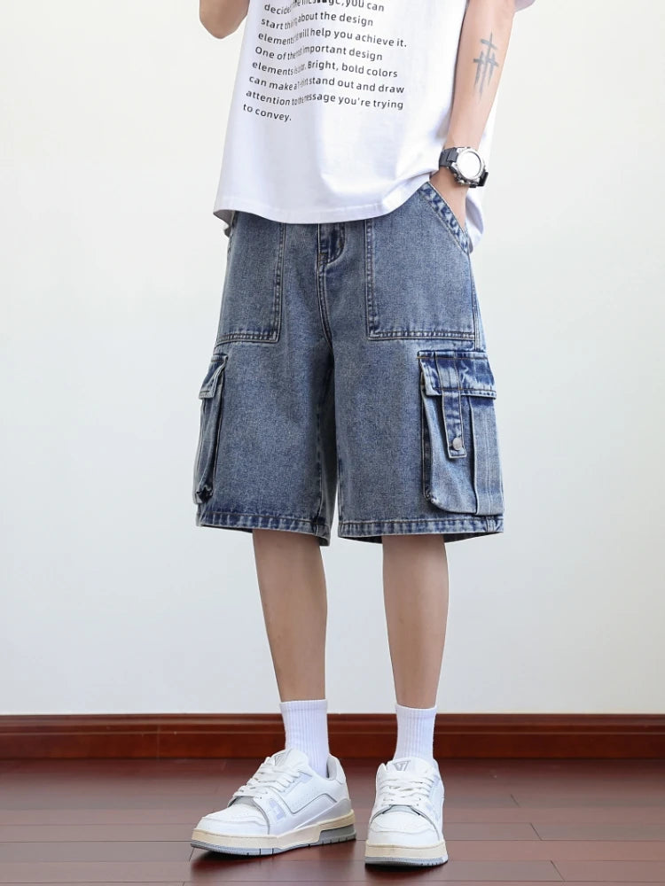 HEARUJOY - Summer Denim Cargo Shorts Men Flap Pockets Wide Leg Baggy Jeans Shorts Big Size 8XL 7XL 6XL Loose Fit Straight Jean Short Male