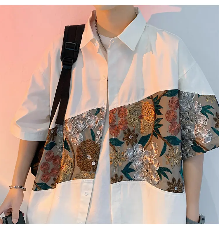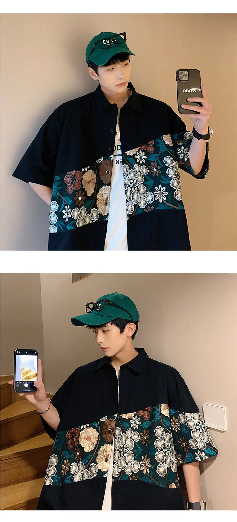 Hearujoy Summer Embroidered Shirt Men Fashion Retro Flower Shirts Men Japanese Streetwear Loose Short Sleeved Shirt Mens Large Size M-5XL