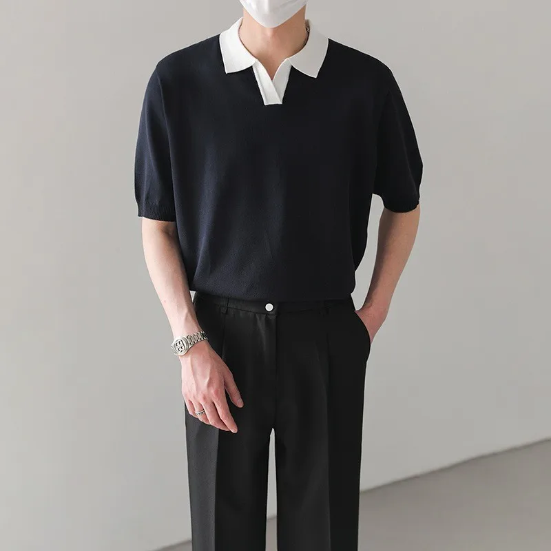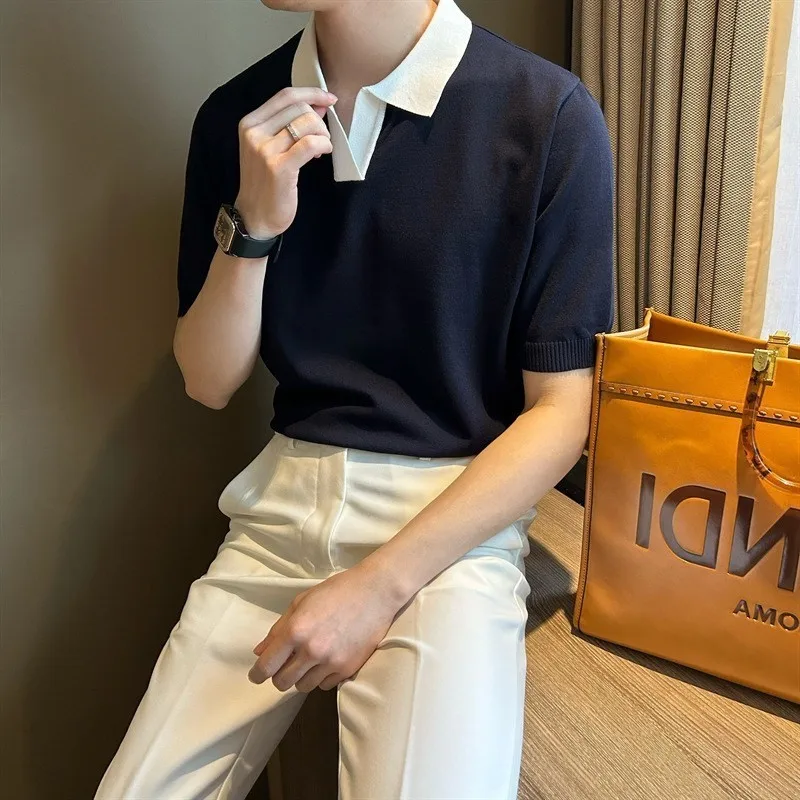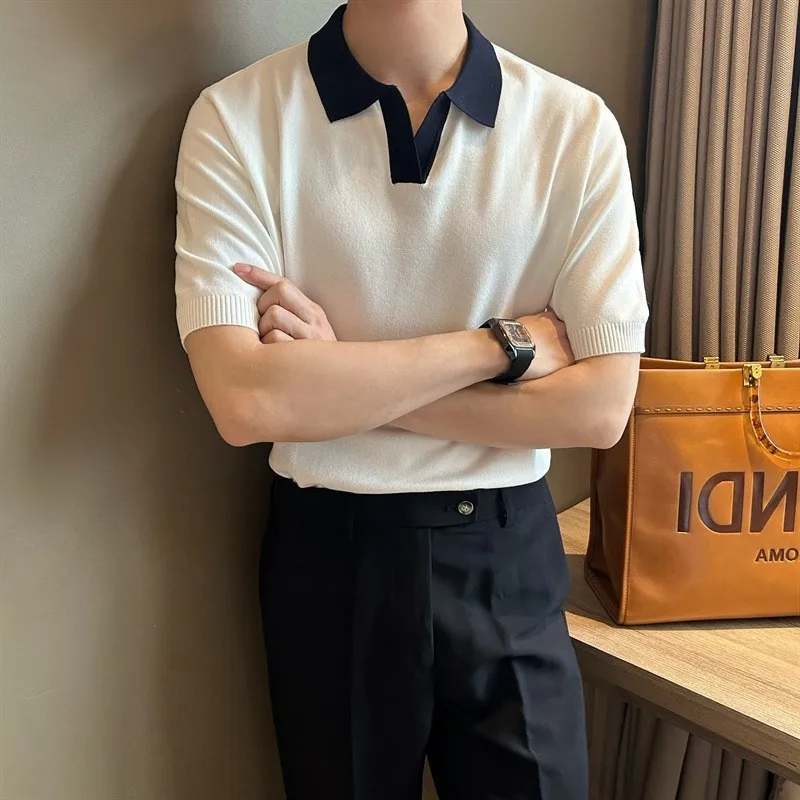 Hearujoy Summer Men's Clothing Light Luxury Korean Popular V Collar Polo Shirt Leisure Short Sleeve Solid Color Retro Slim Knitwear M-3XL