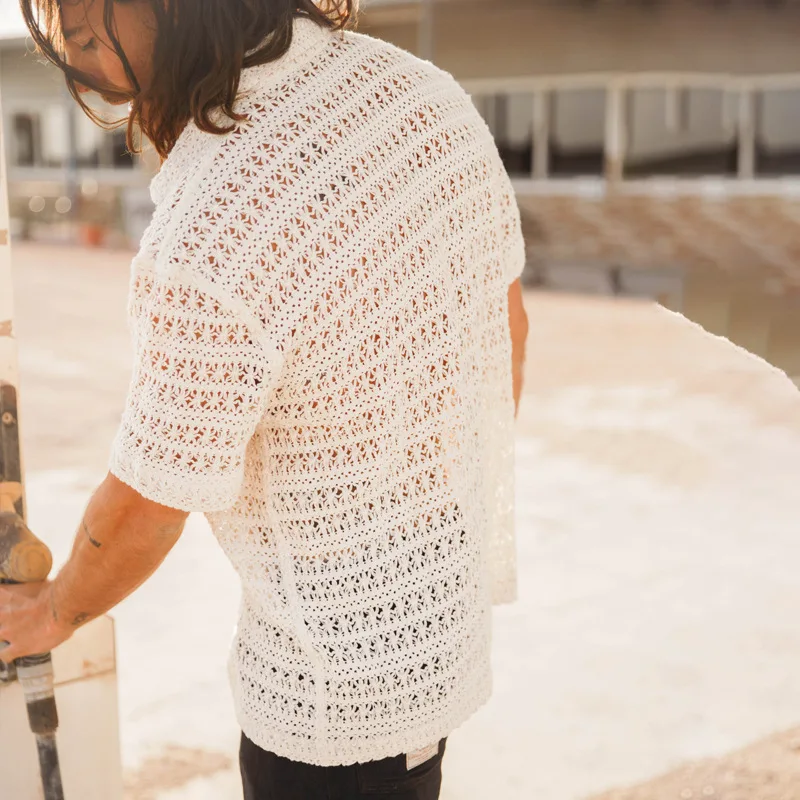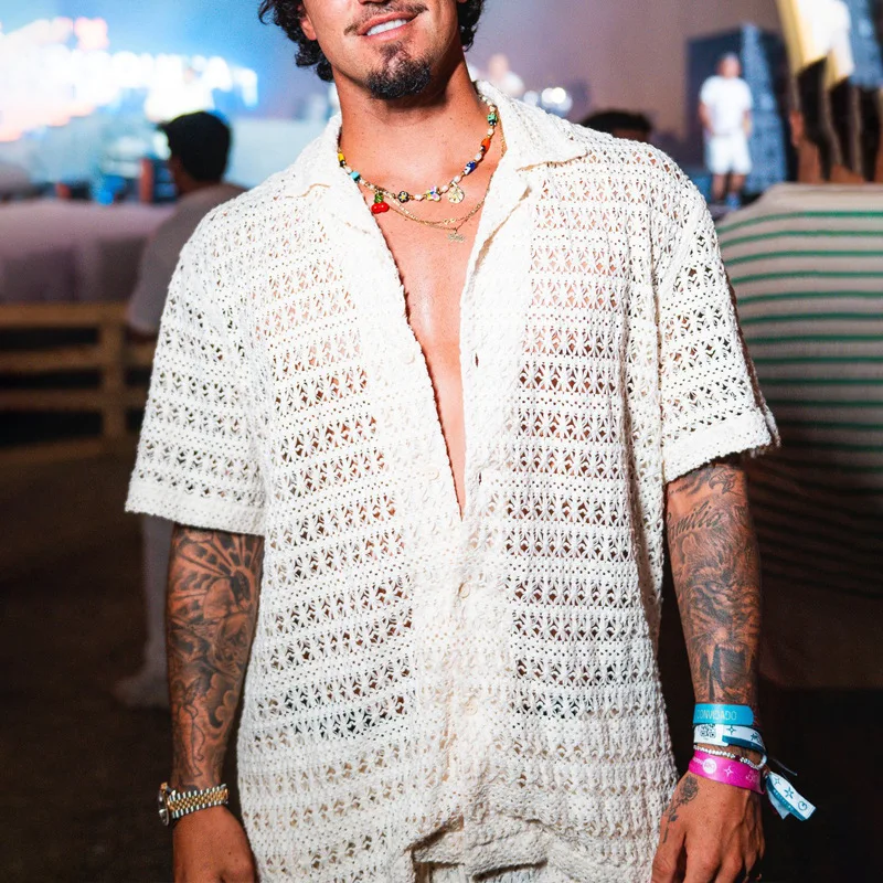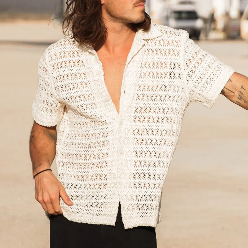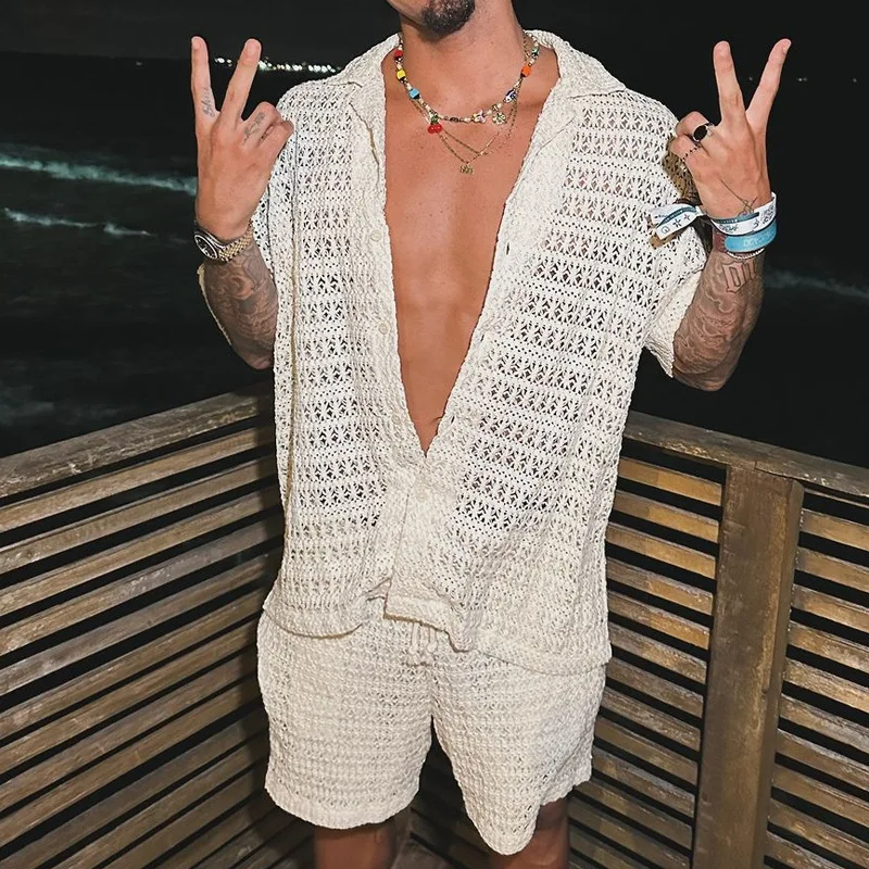 HEARUJOY - Summer Men's Knit Hollow Out Suits Sexy Jacquard Mesh Short Sleeve Shirt And Shorts Two Piece Set Fashion Knitted Sports Outfits