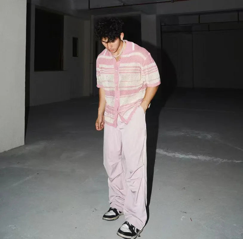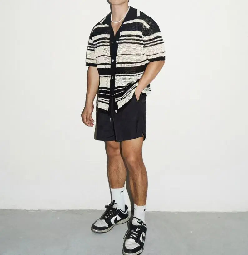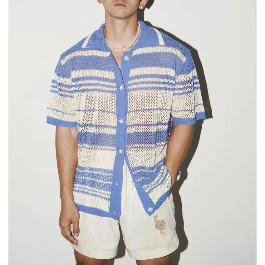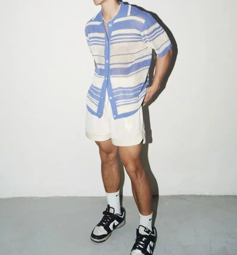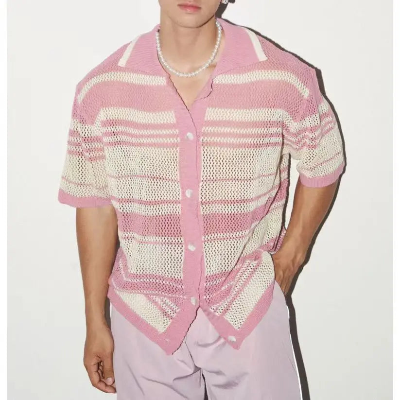 HEARUJOY - Summer New Fashion Casual Breathable Hollow Out Knitted Polo Shirts Men Striped Crochet Knitting Tops Vintage Mens Clothes