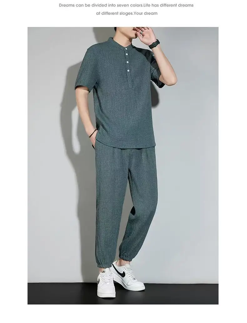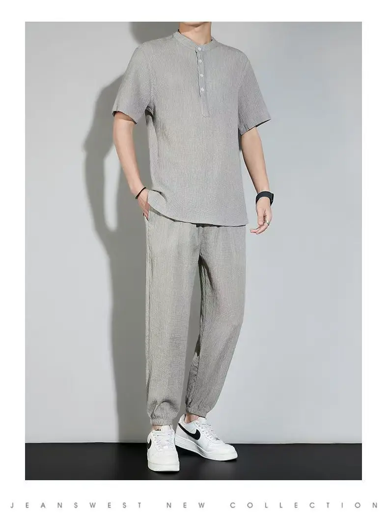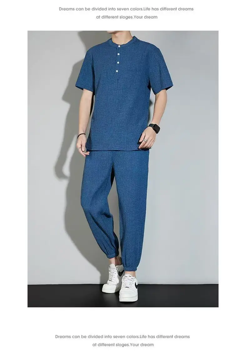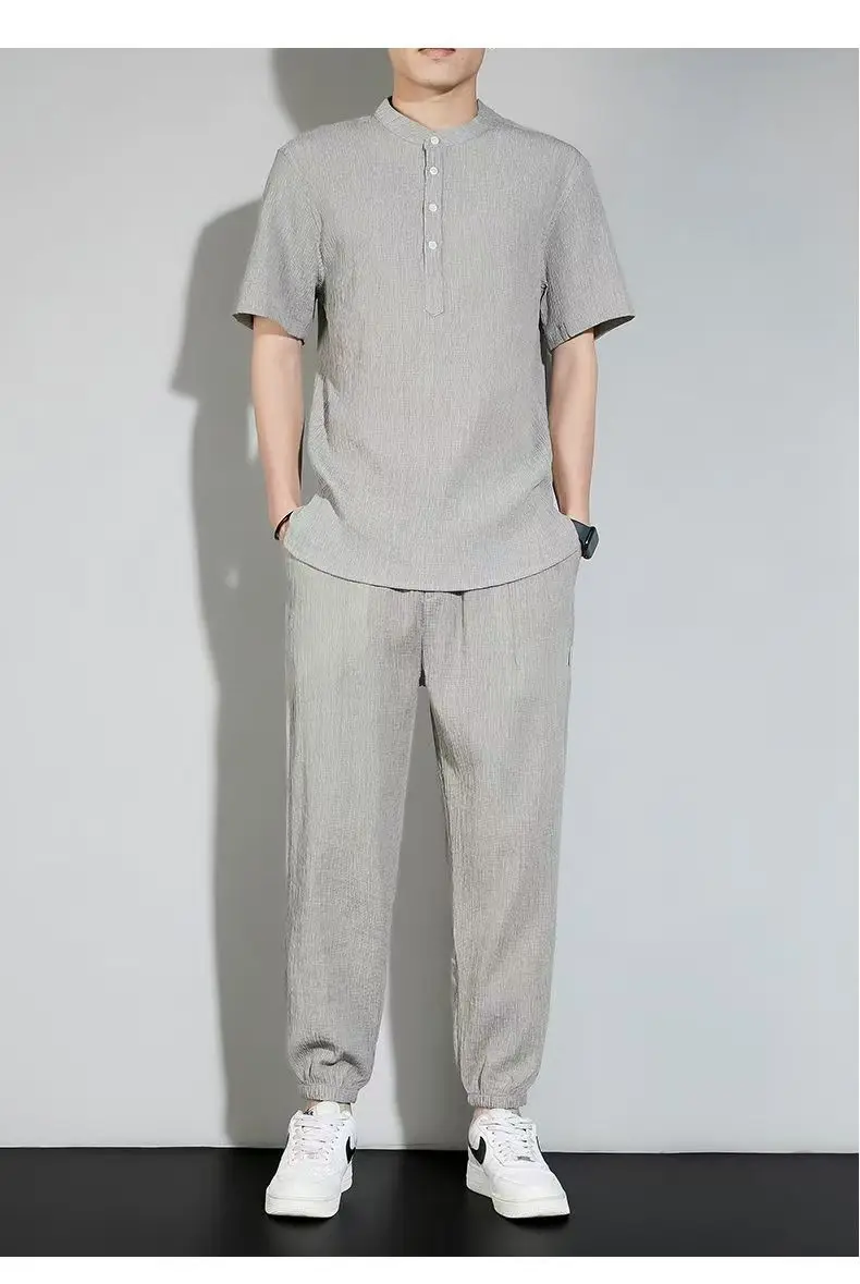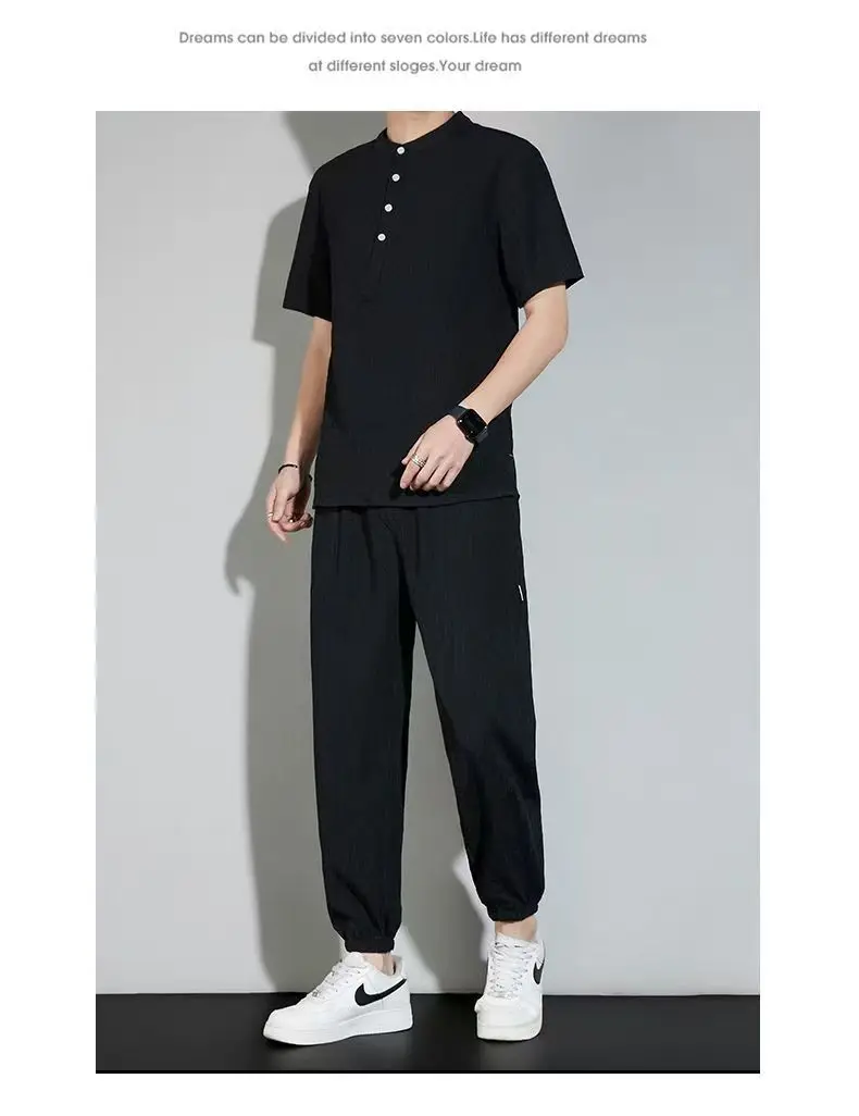 HEARUJOY - Summer New Loose Two Piece Set Men's Short-sleeved T-shirt Pants Korean Wrinkle Sports Casual Suit Trend Men Clothes