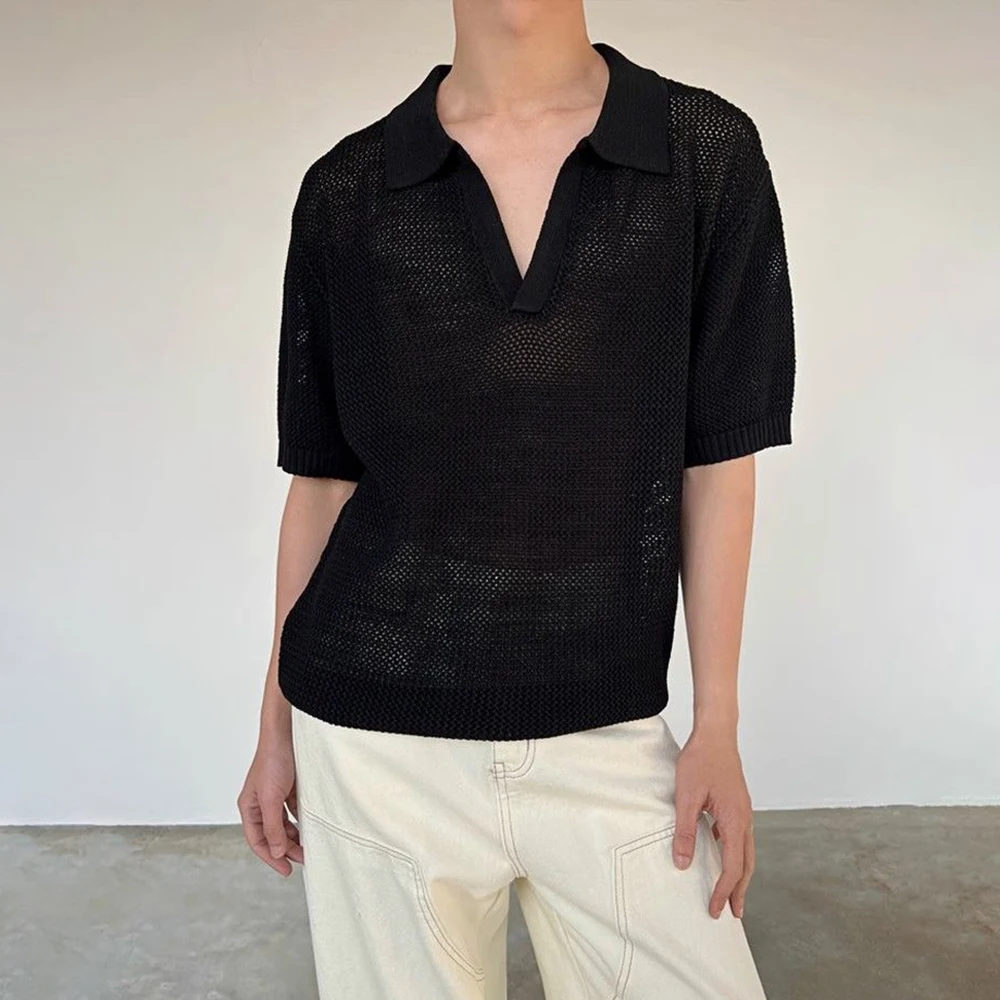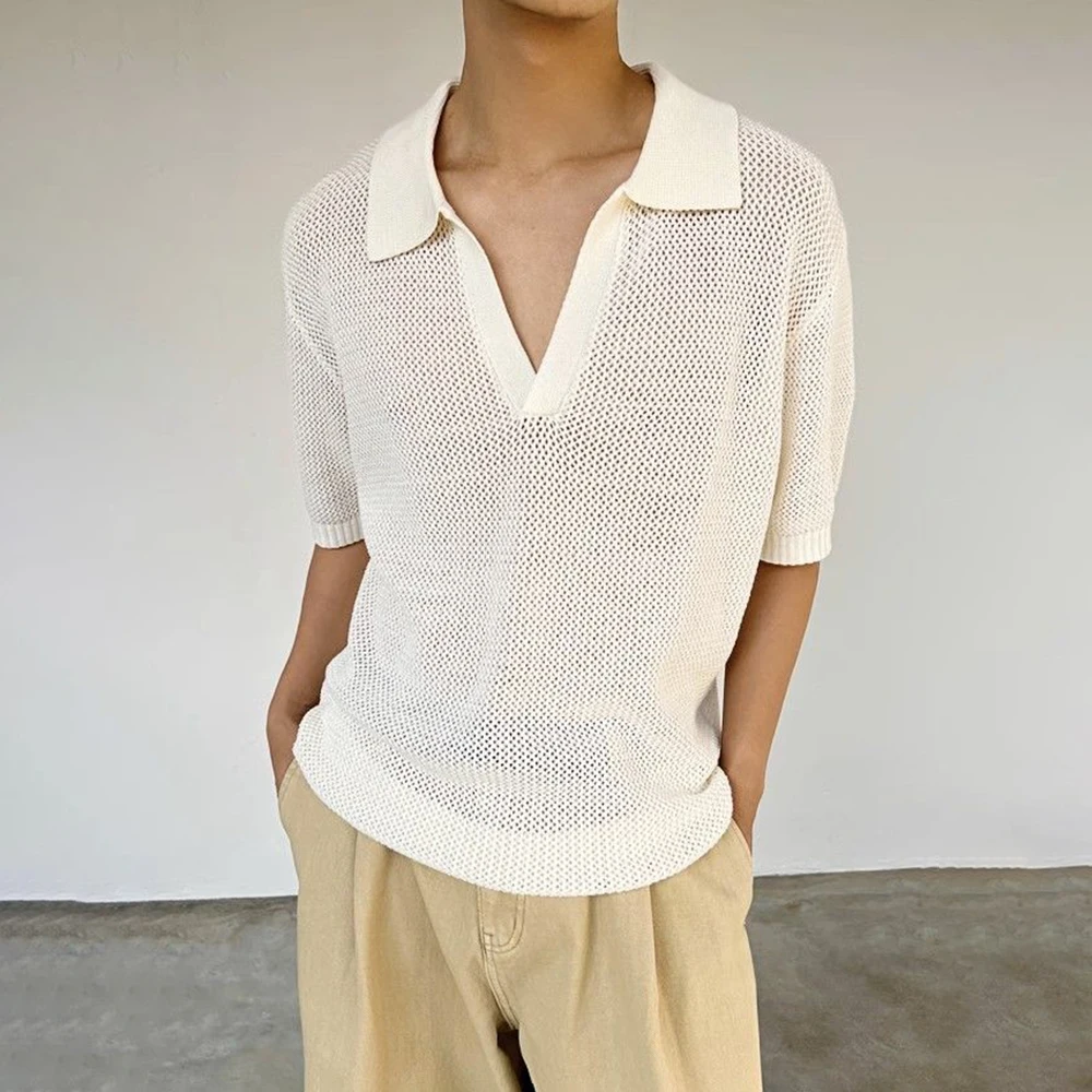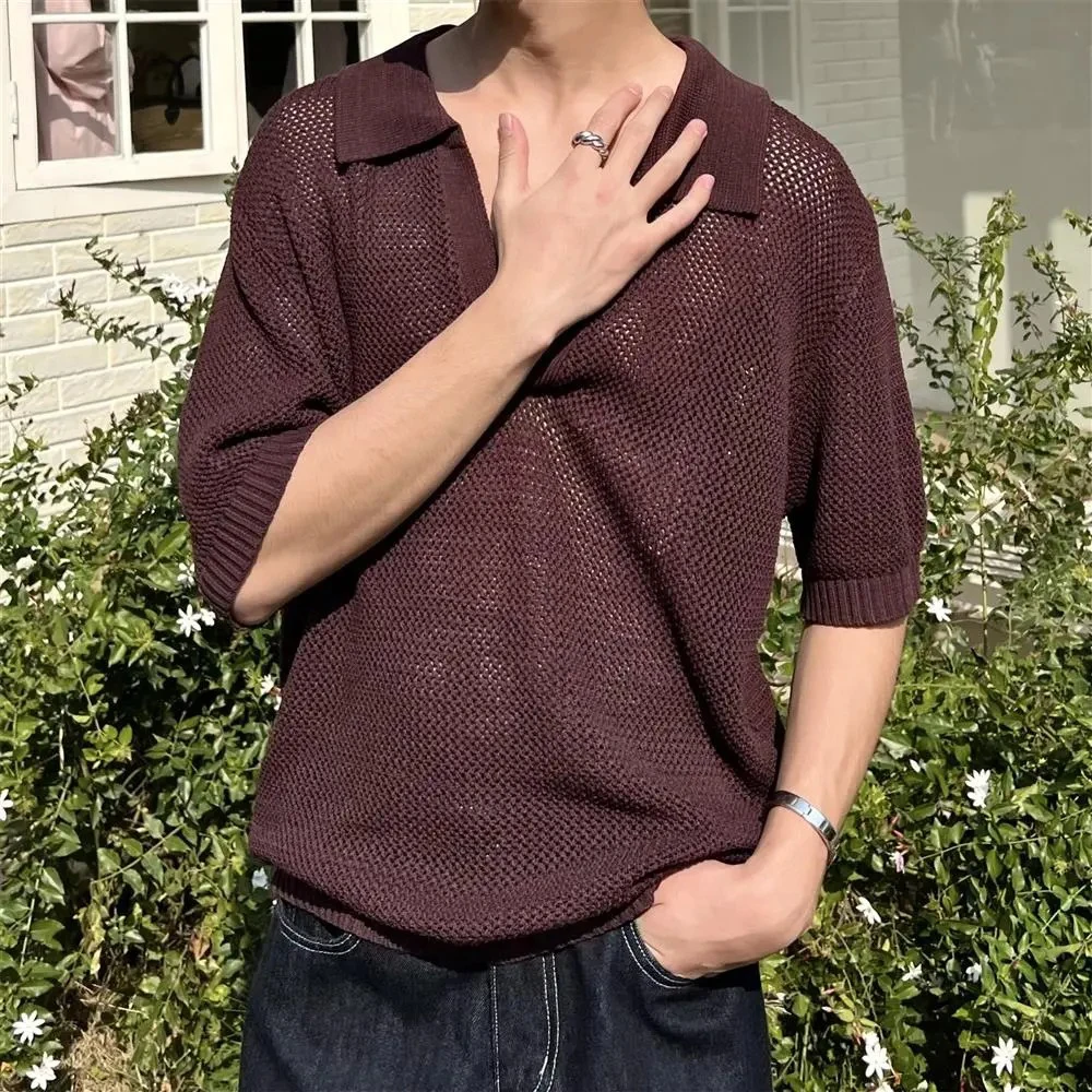 HEARUJOY - Summer New Men's Hollow Solid Color Knitted Short-Sleeved T-Shirt Retro Fashion Trend Casual Simple Loose Breathable Men's Tops