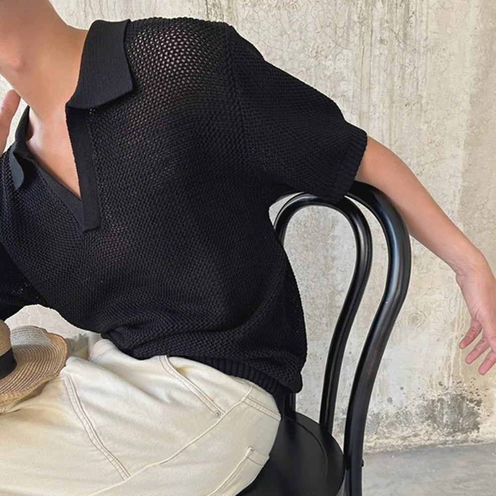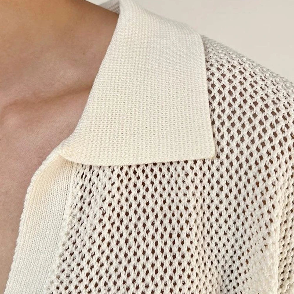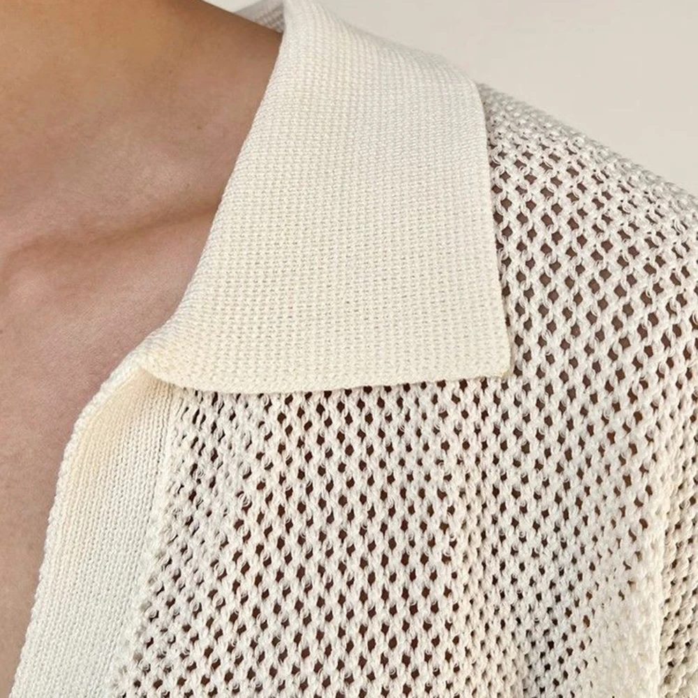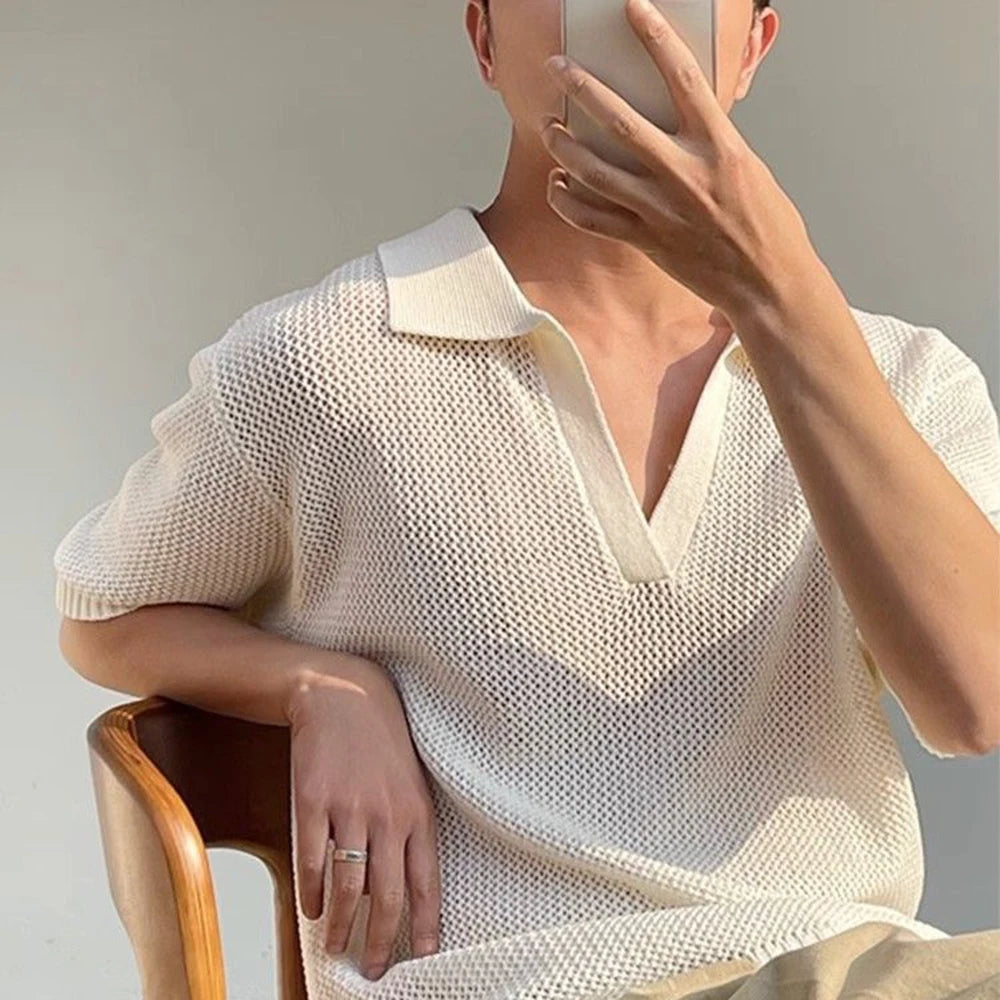 HEARUJOY - Summer New Men's Hollow Solid Color Knitted Short-Sleeved T-Shirt Retro Fashion Trend Casual Simple Loose Breathable Men's Tops