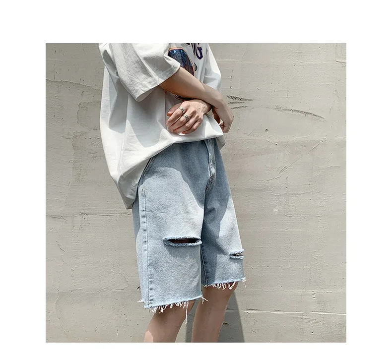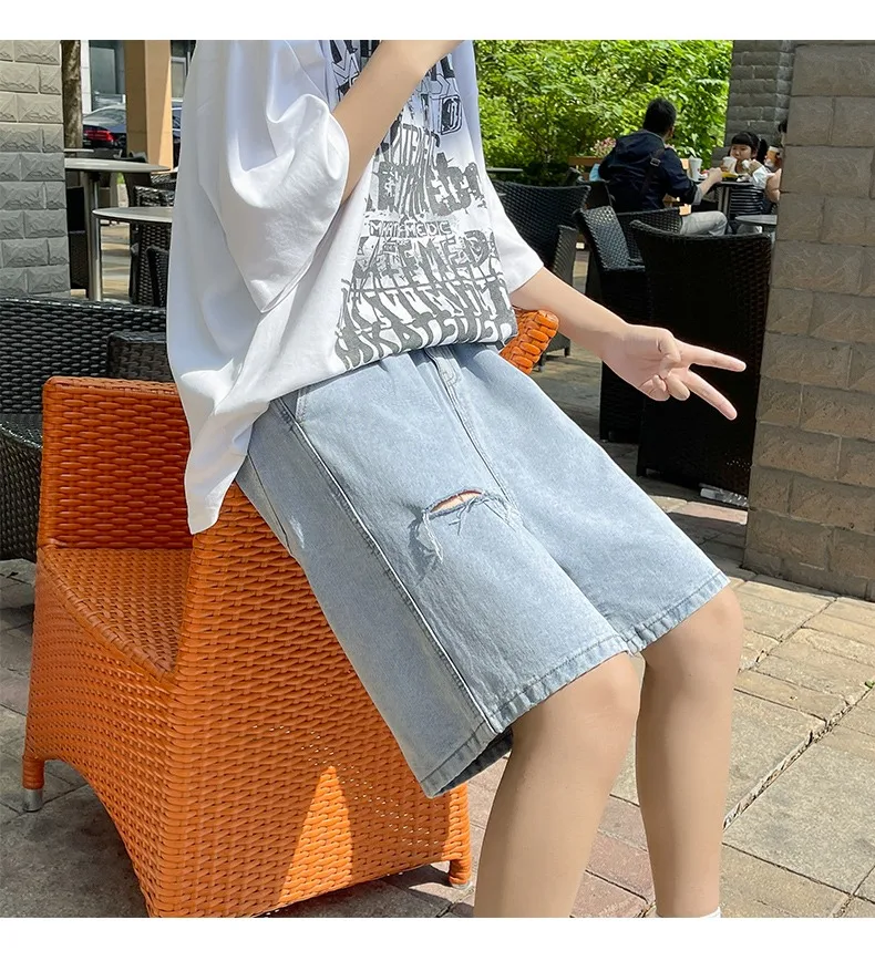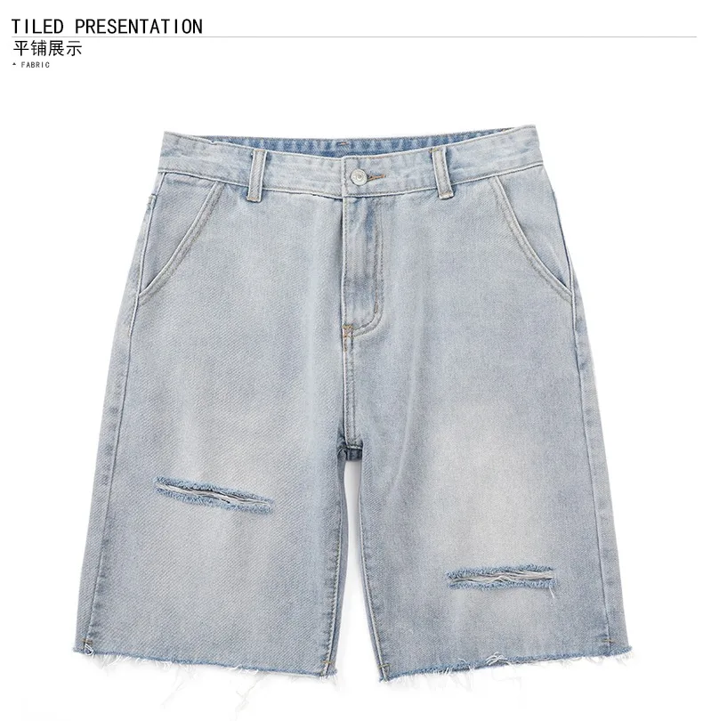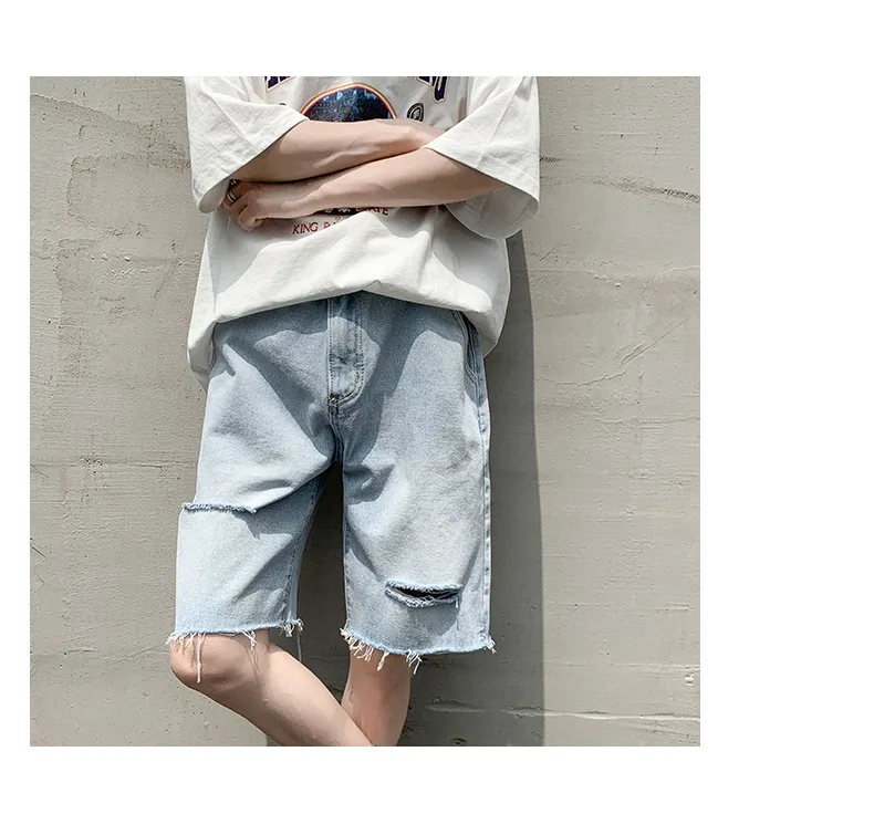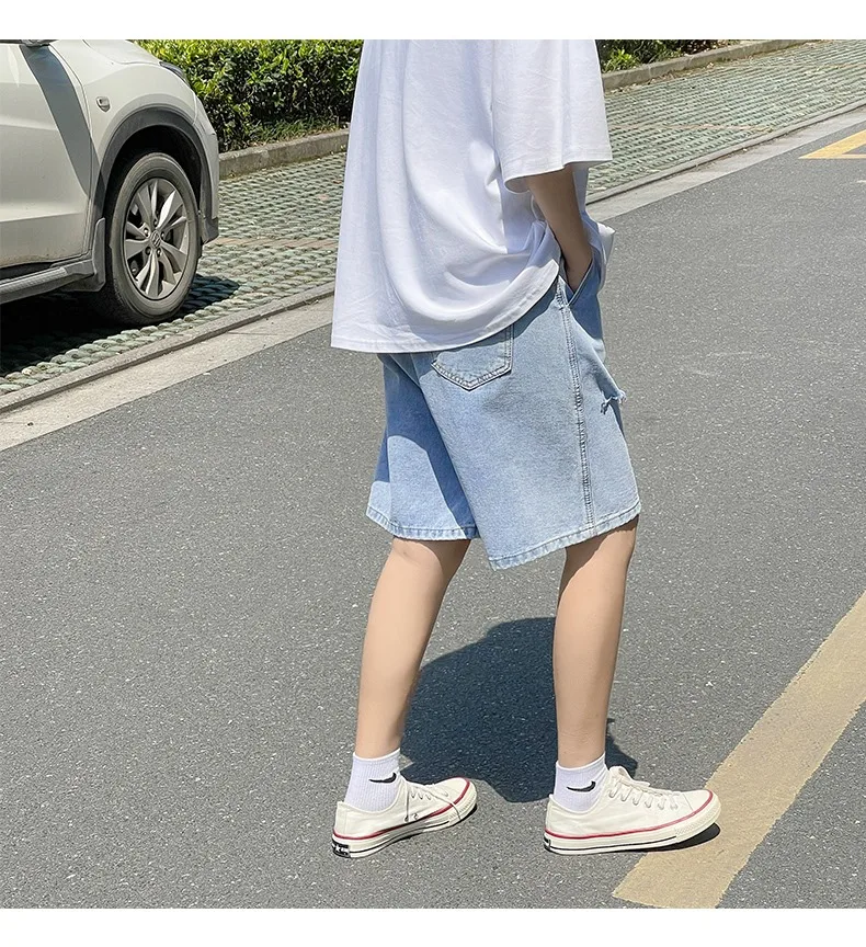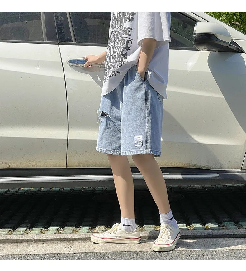 Hearujoy summer new men's light blue denim shorts simple solid color ripped pants loose casual pants S-2XL