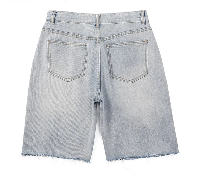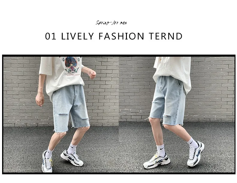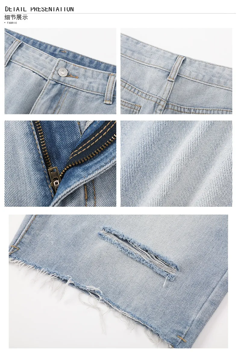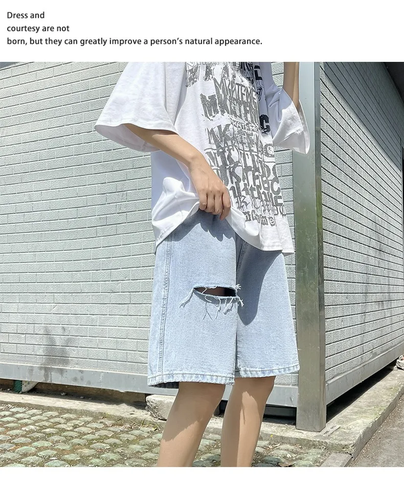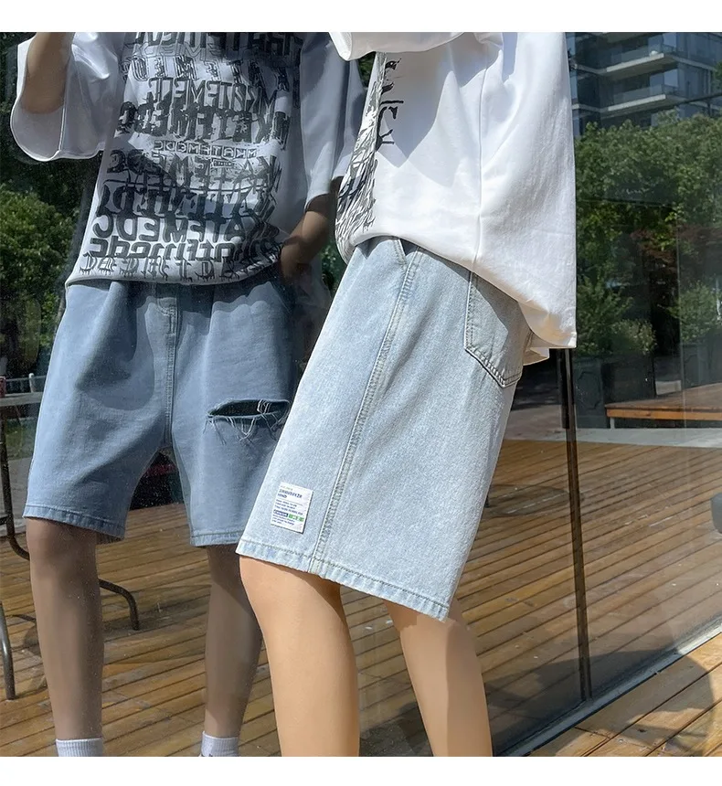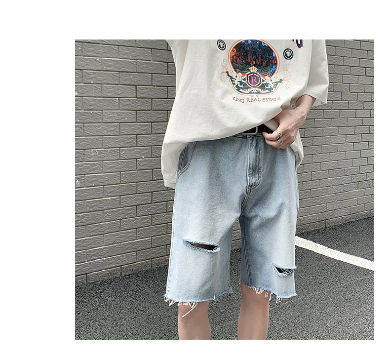 Hearujoy summer new men's light blue denim shorts simple solid color ripped pants loose casual pants S-2XL