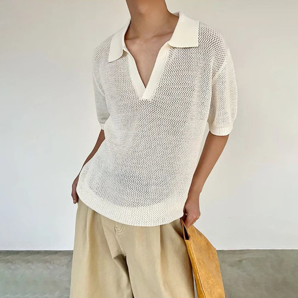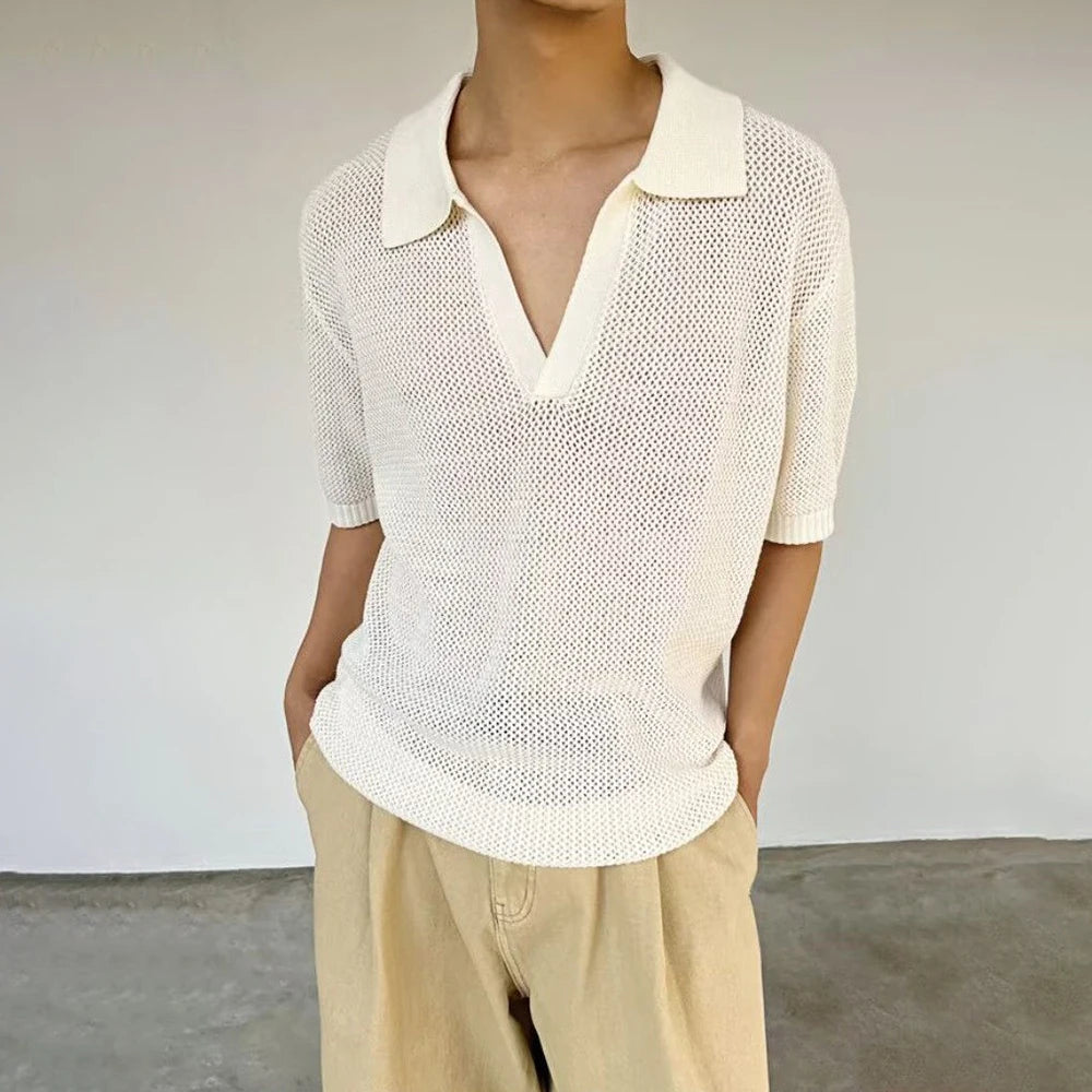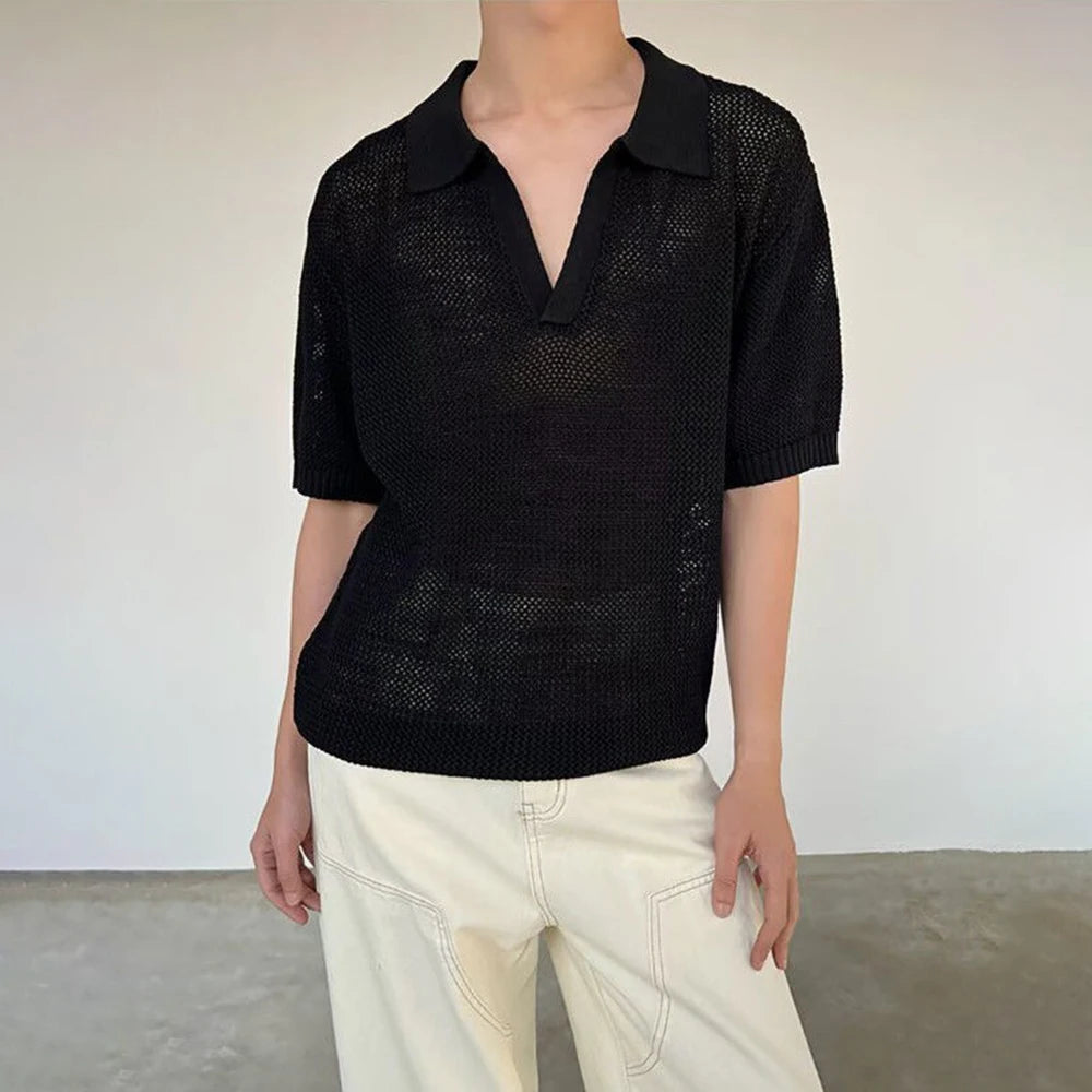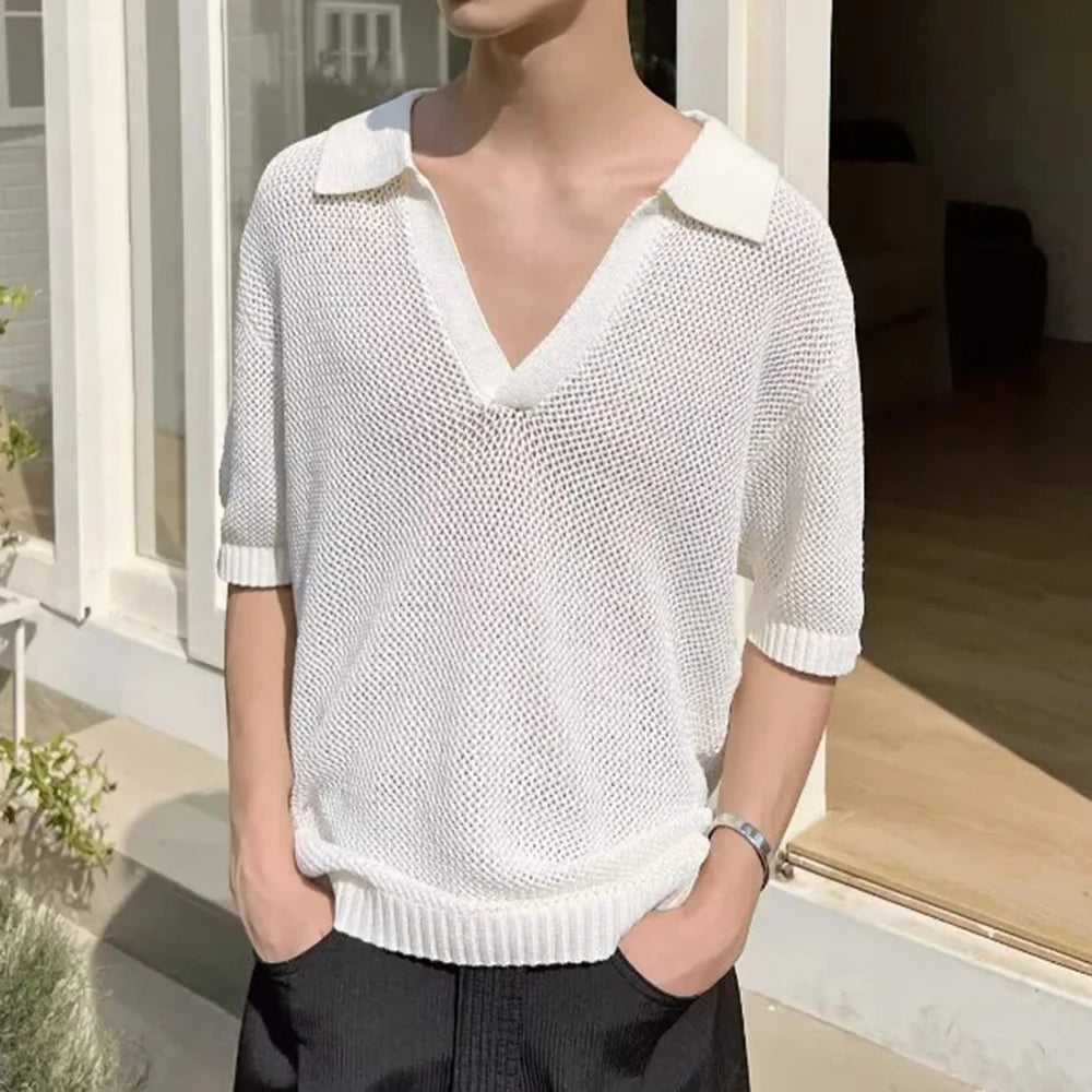 HEARUJOY - Summer New Men's Solid Color Hollow Short Sleeve T-shirt American Retro Fashion Trend Loose Simple Breathable Men's Tops
