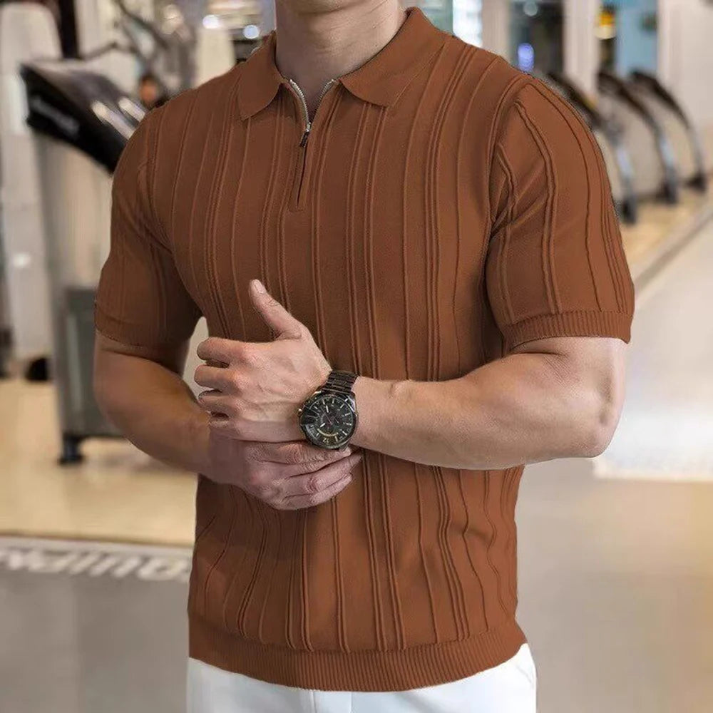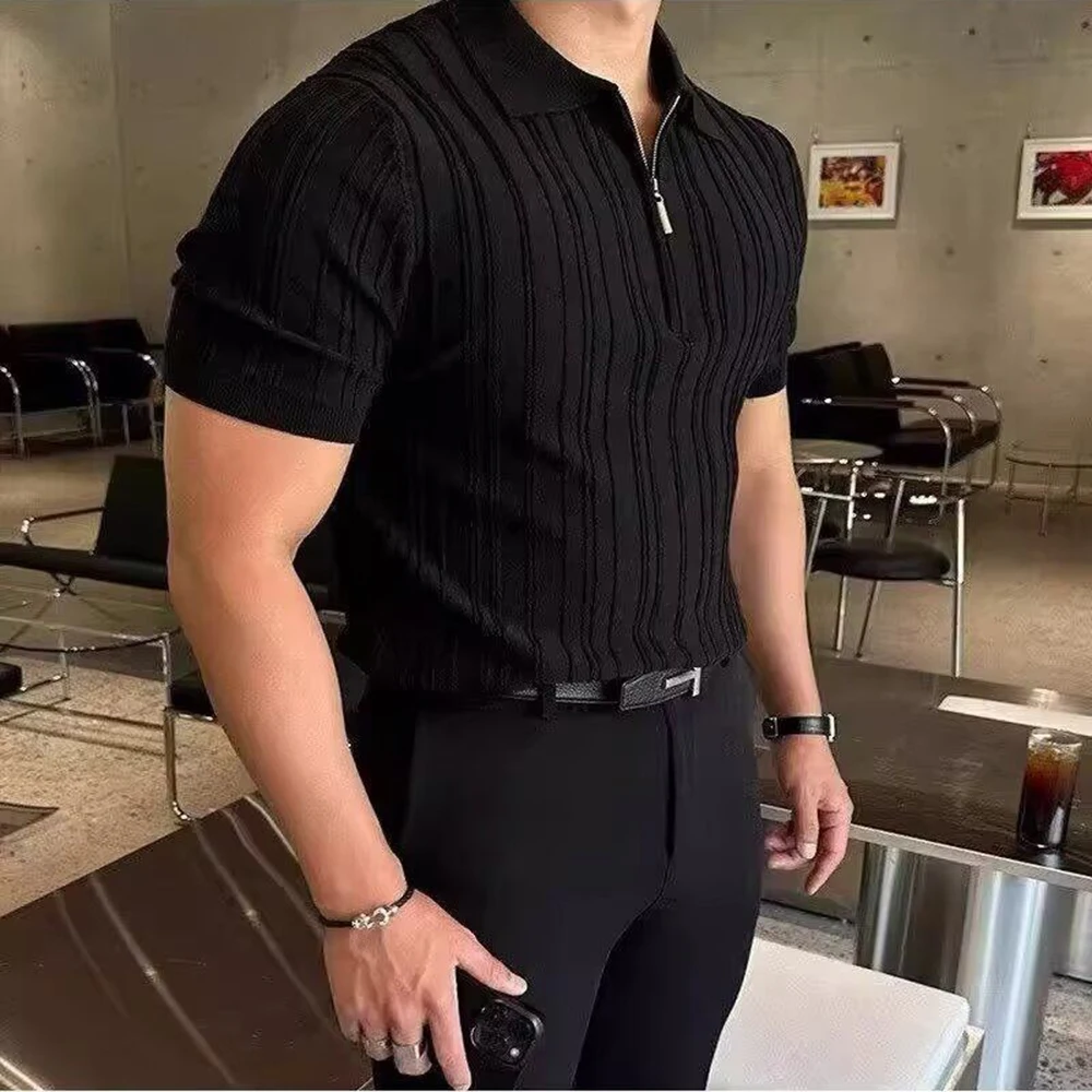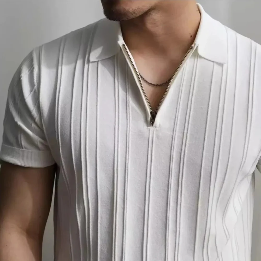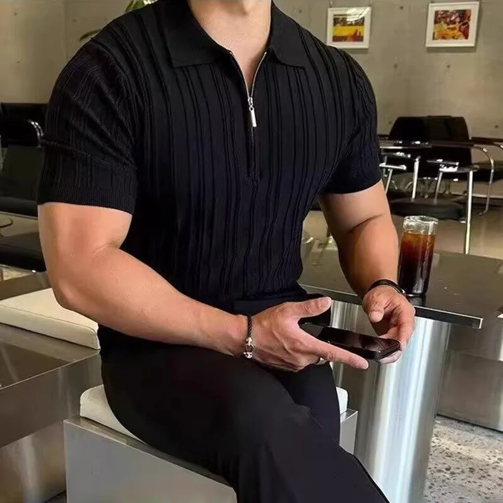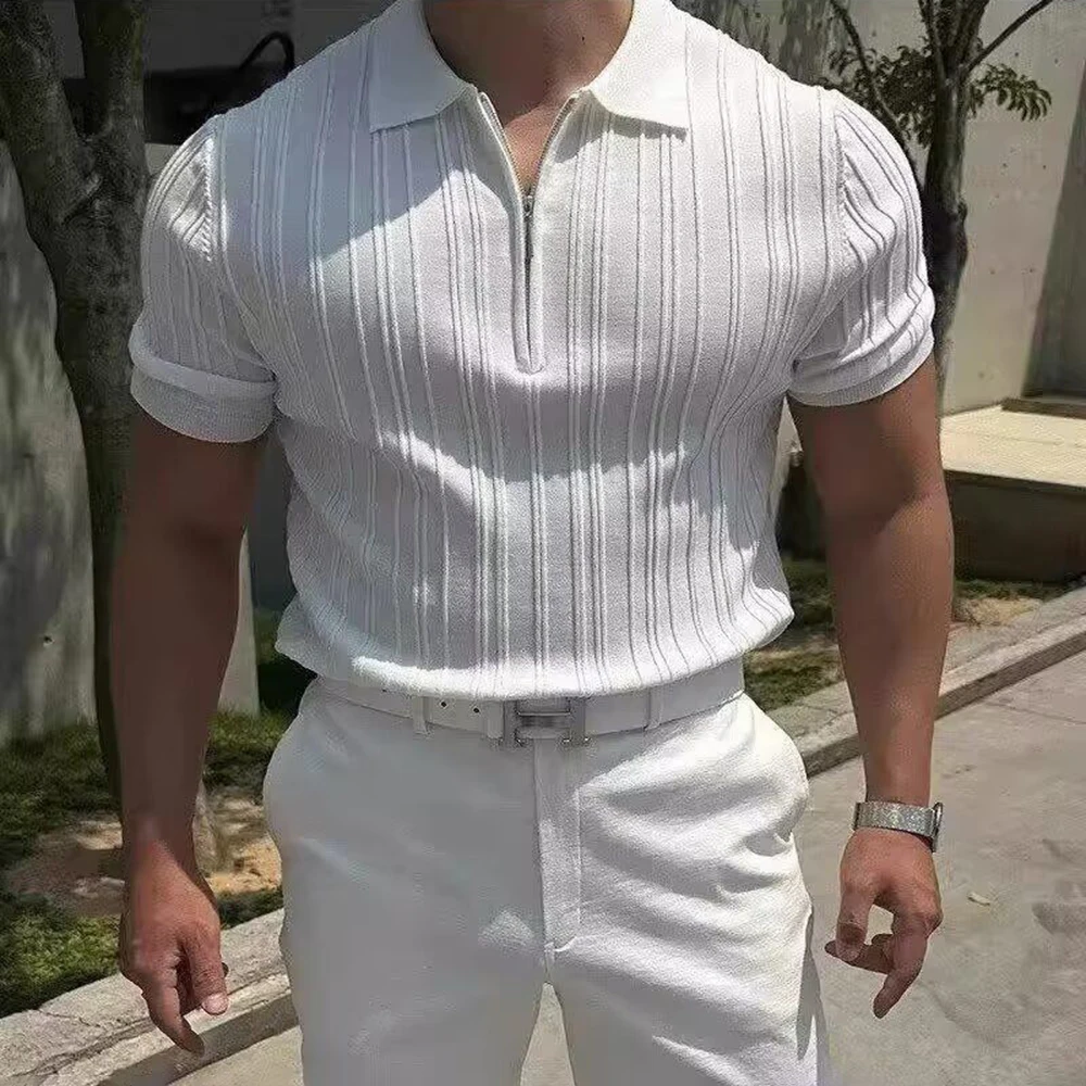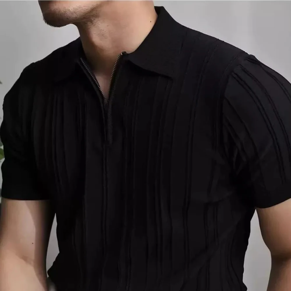 HEARUJOY - Summer New Men's Solid Color Knitted Jacquard Short Sleeve T-shirt Retro Trend Fashion Casual Simple Slim Men's Tops