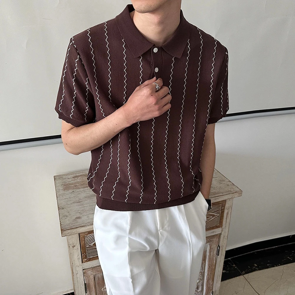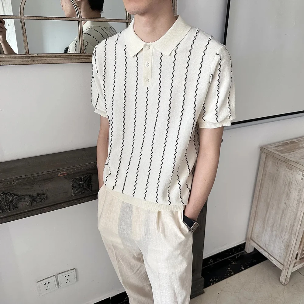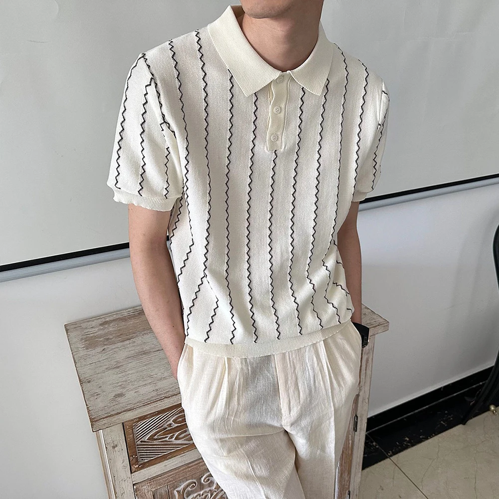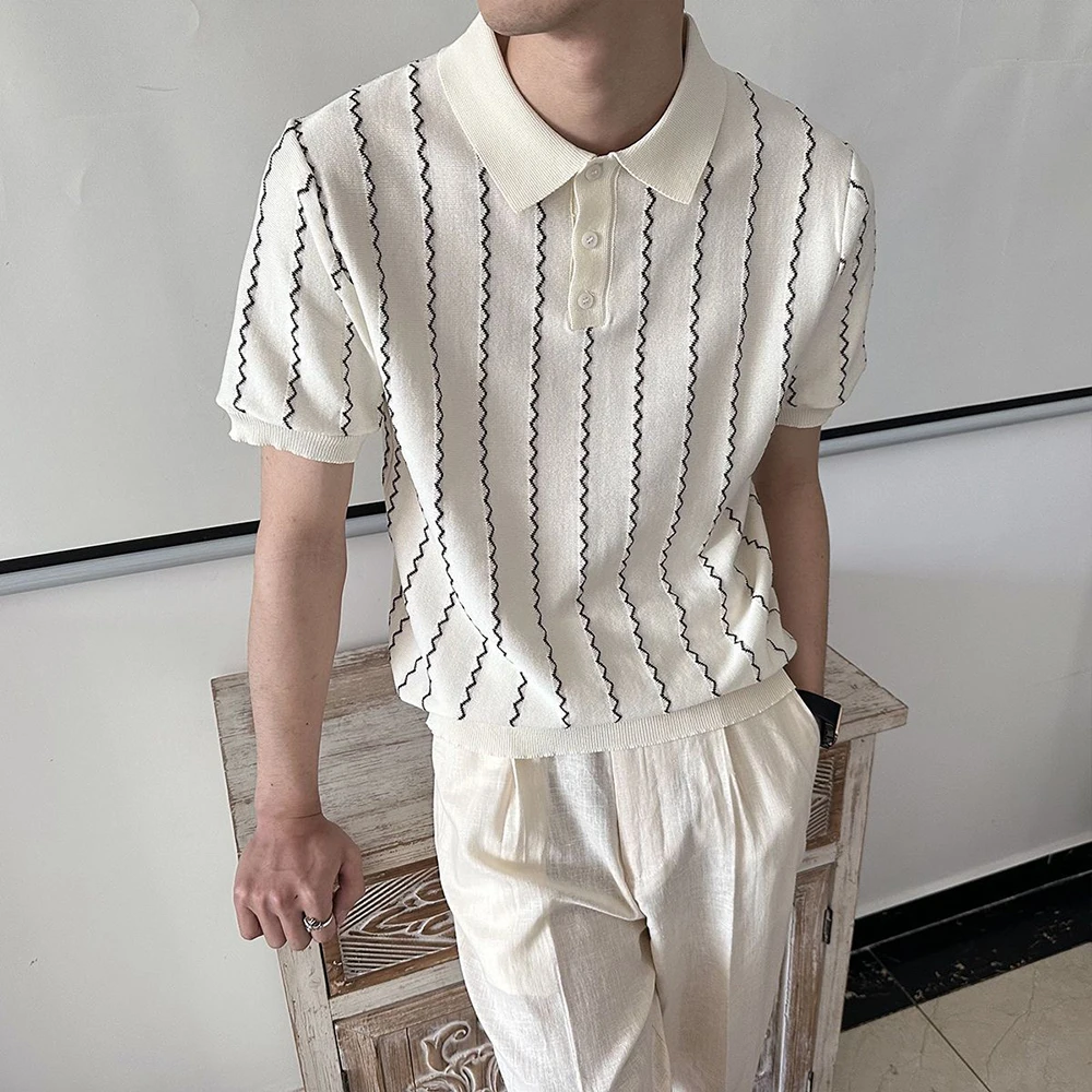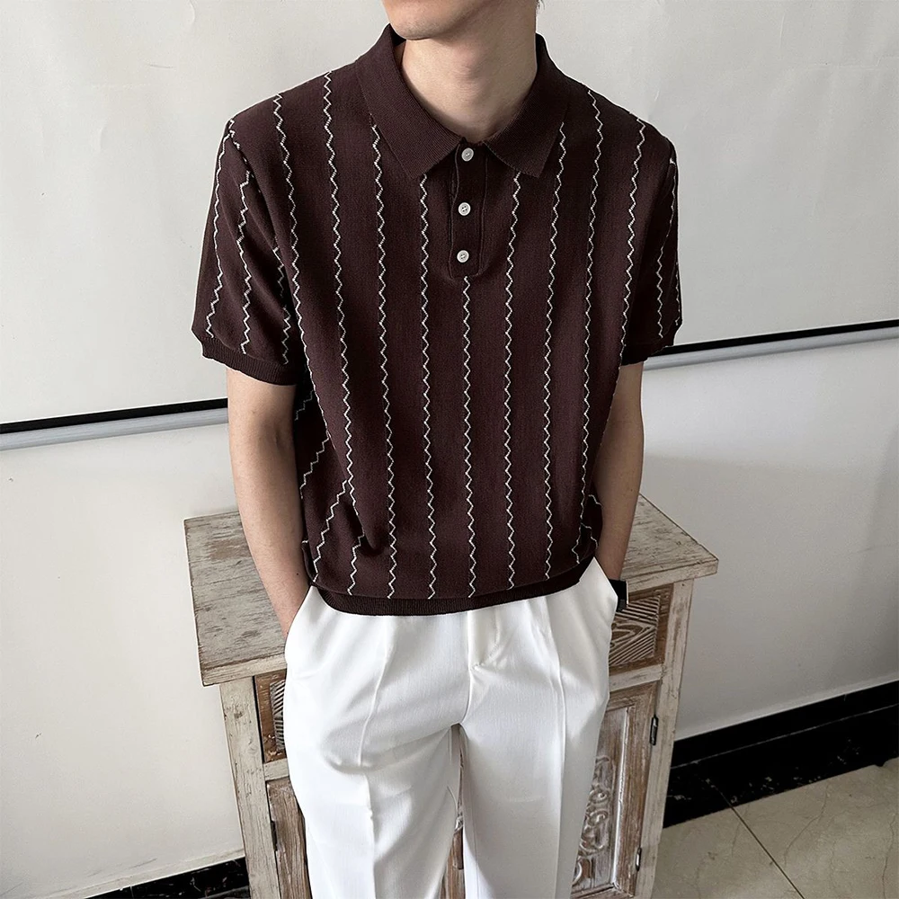 HEARUJOY - Summer New Men's Striped Knitted Short-Sleeved T-Shirt Retro Fashion Trend Casual Simple Loose Breathable Business Men's Tops