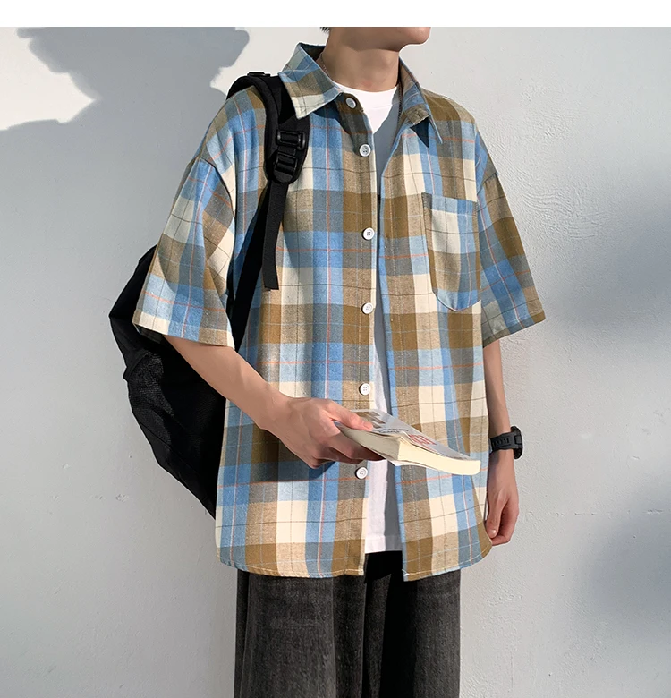 Hearujoy Summer Short Sleeved Shirt Men Oversized Retro Plaid Shirt Men Streetwear Loose Casual Shirt Mens Hawaiian Shirt Large Size 5XL