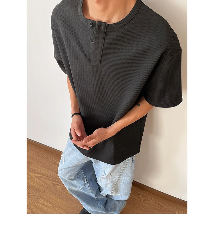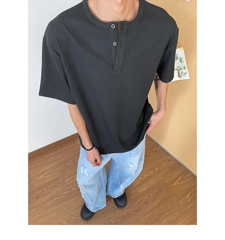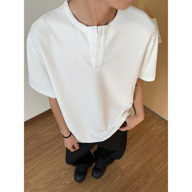 HEARUJOY - Summer Short Sleeved T-shirt Men Black White Casual T Shirt Men Streetwear Korean Loose Round Neck Button T Shirt Mens Top M-3XL