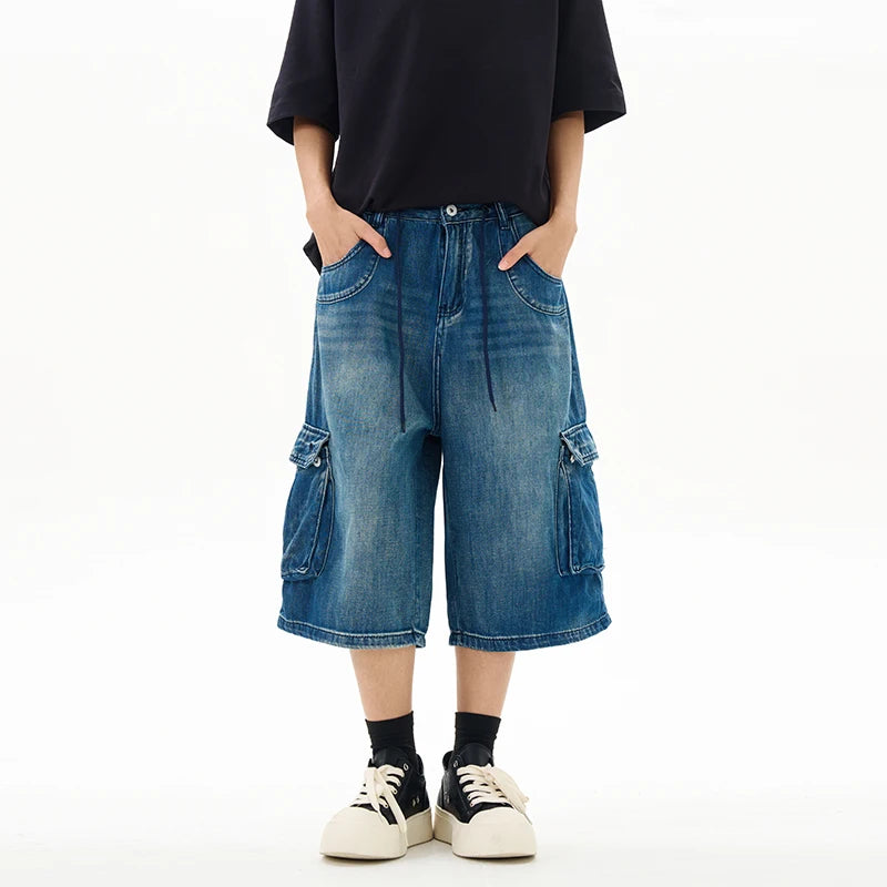 HEARUJOY - Summer Thin Washed Loose Multi-pocket Denim Cropped Pants For Men High Street Straight Distressed Street Wide-leg Jeans Shorts