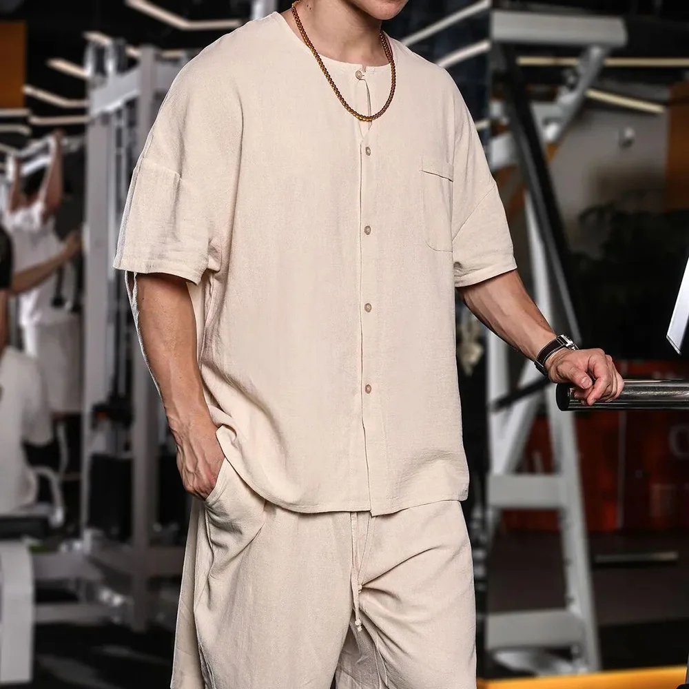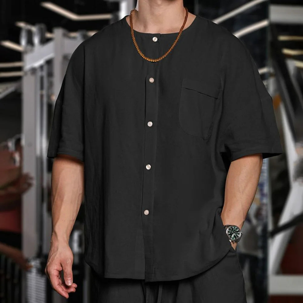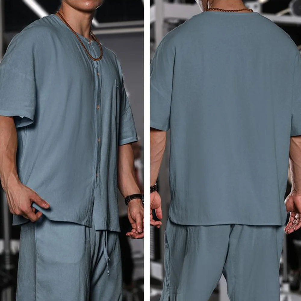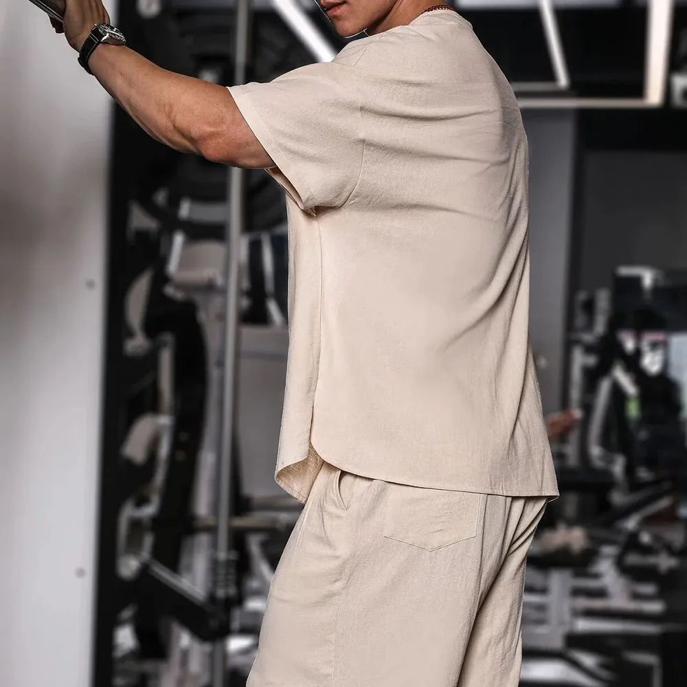HEARUJOY - T Shirt Mens Gym Daily Simple Pocket Button Five Point Sleeve Shirt Sports Outdoor Breathable Linen Easy Fit Casual Top Summer
