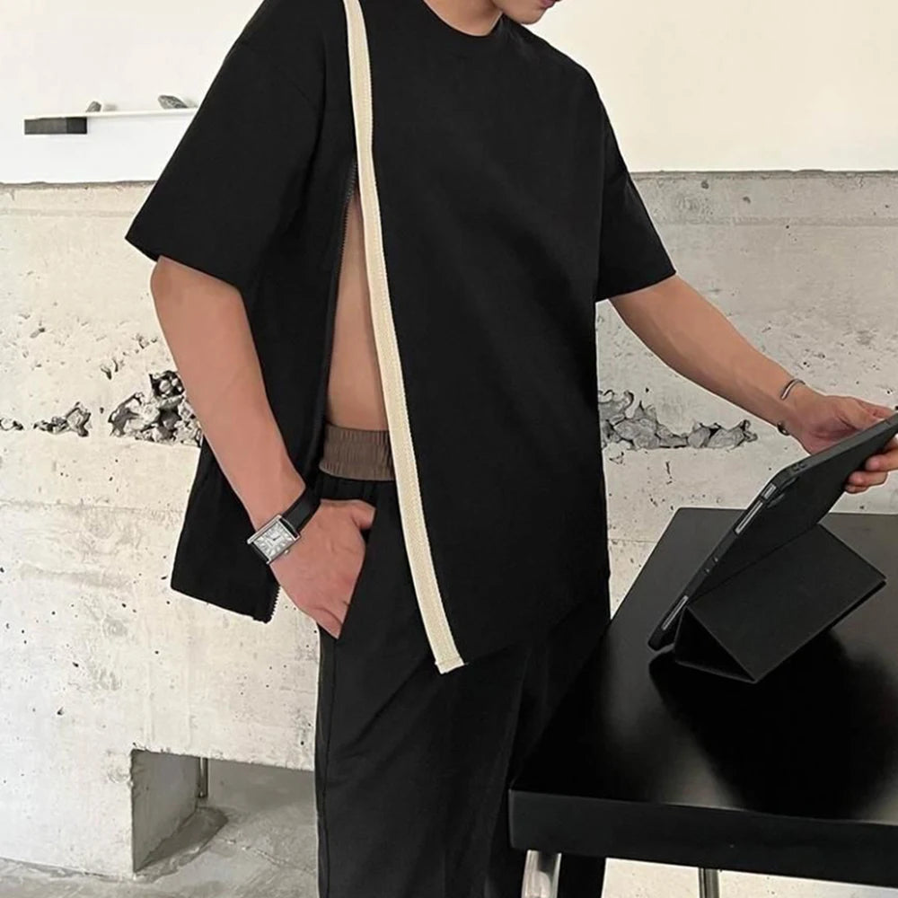 Hearujoy T-Shirts Male Tshirts Men Summer Short Tee Shirt Man Fashion Sexy Tees Top Contrast Ribbon Slit Camisetas Genderless Streetwear