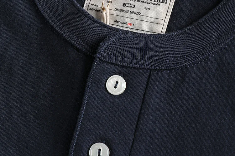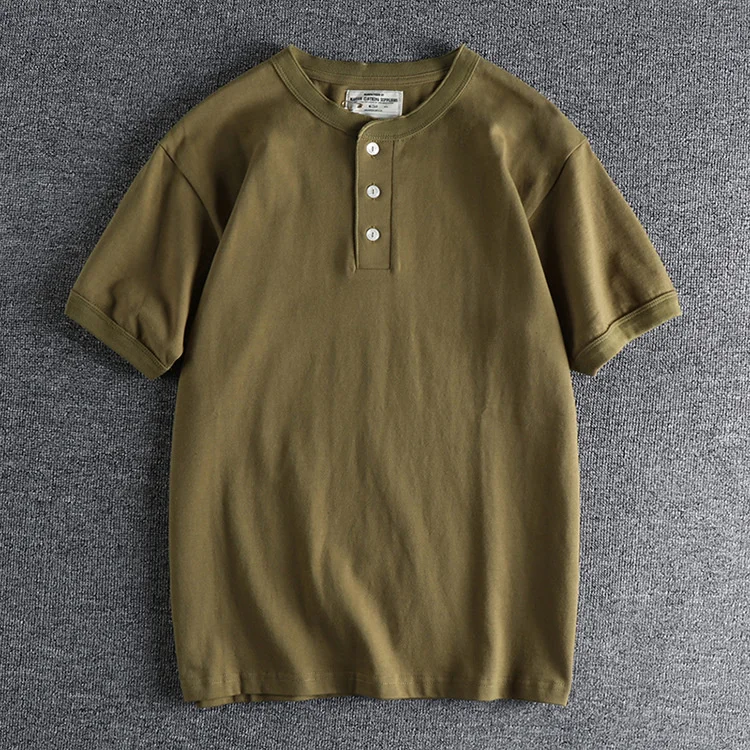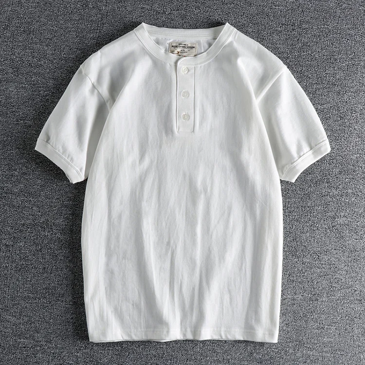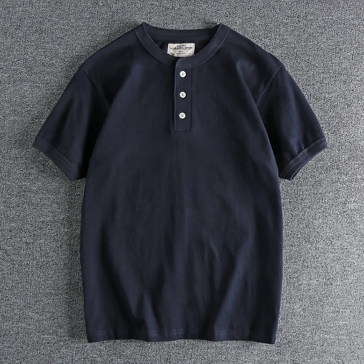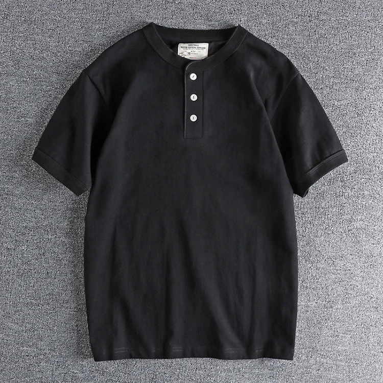 HEARUJOY - Tough Guy Style Heavyweight Wash Cotton Henry Neck Short Sleeve T-shirt Men's Summer Personalized Versatile Tops Tee Sold Color