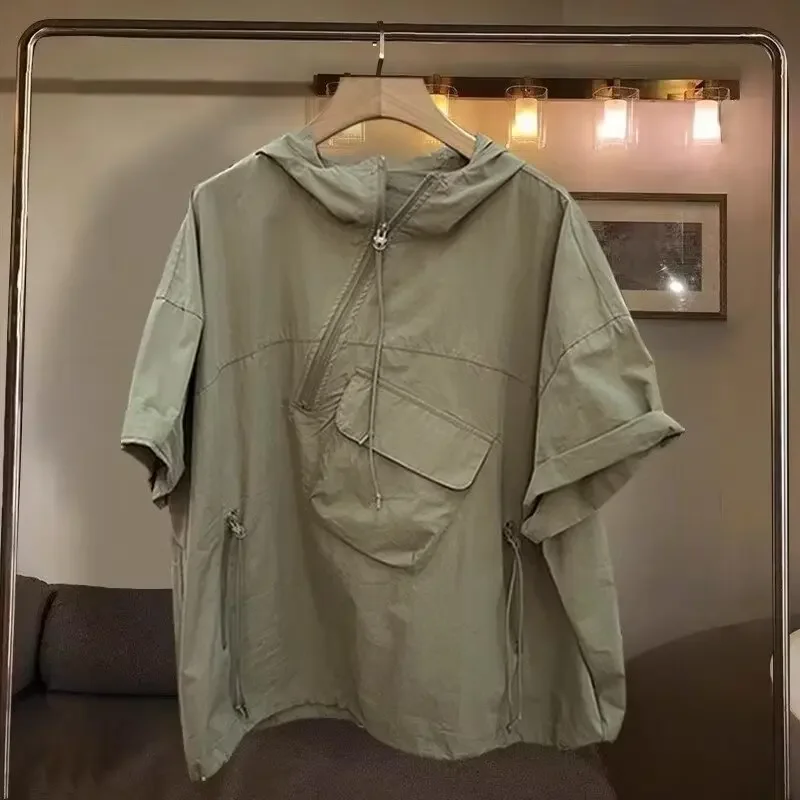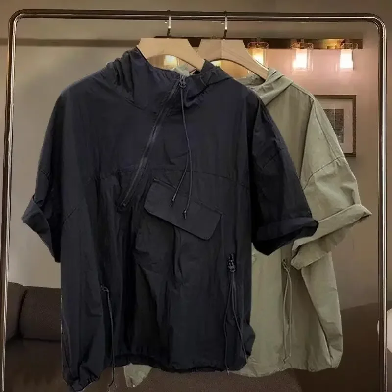Hearujoy Trendy Solid Color Zippered Hooded Sleeve Men's T-shirt Fit Half Sleeve Summer Fashion Work Uniform Pocket Design Sensibility