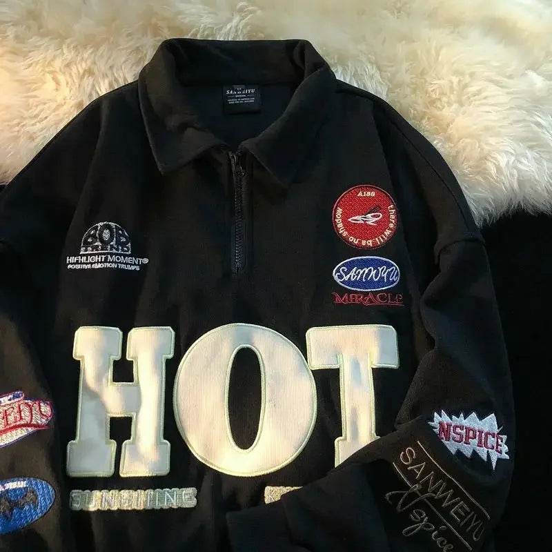 Hearujoy Vintage collar long-sleeved T-shirt spring American patch embroidered sweatshirt couple grunge baseball uniform shirt