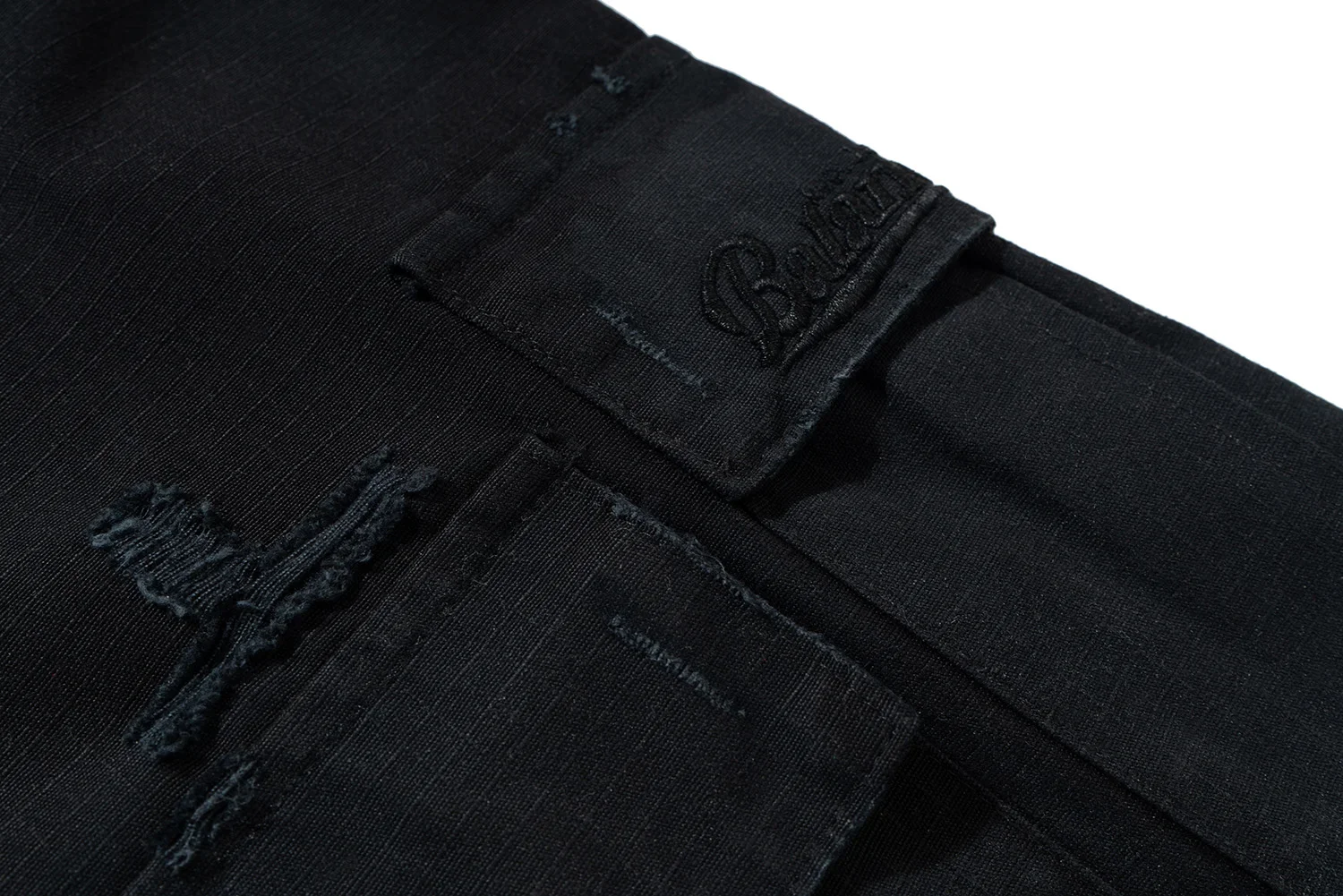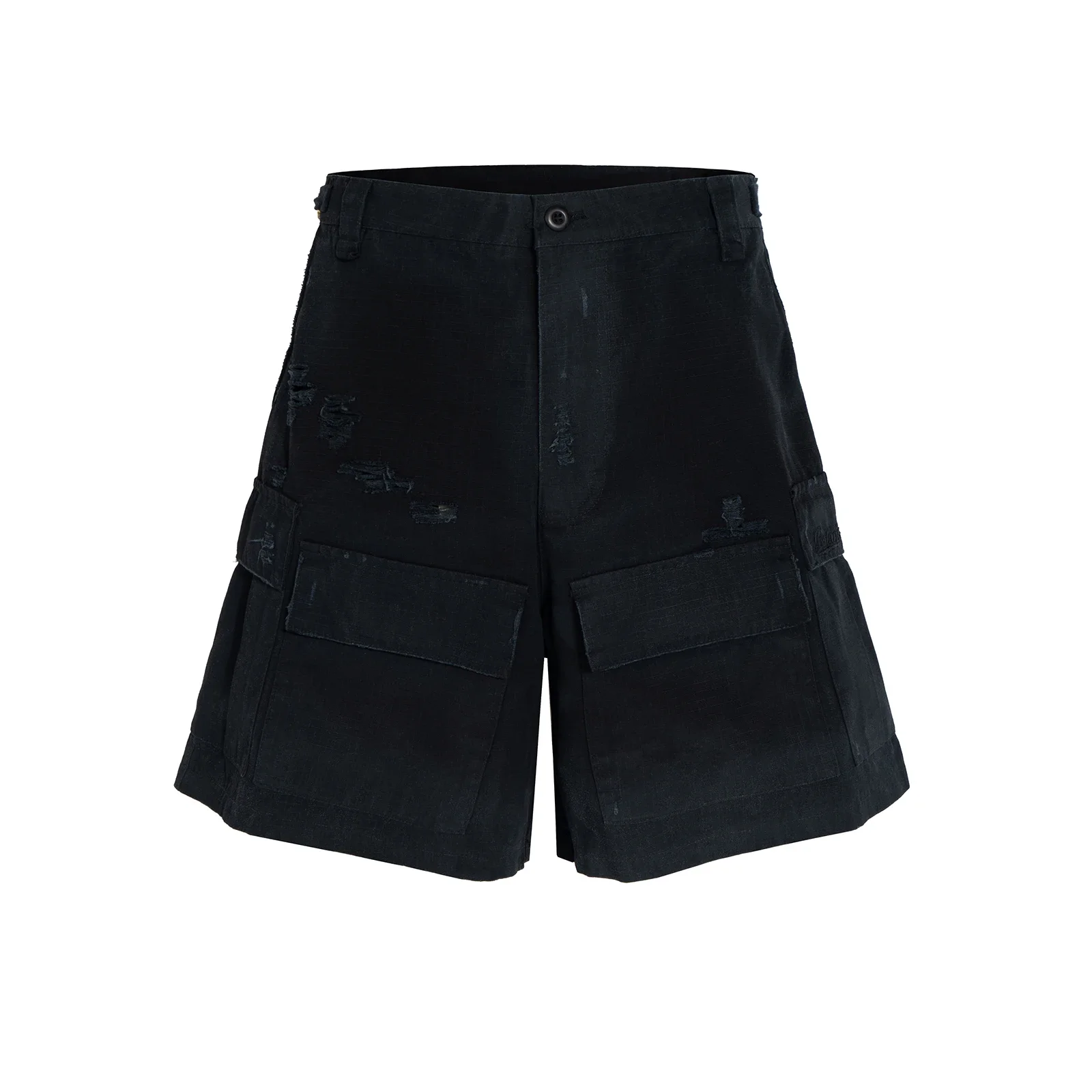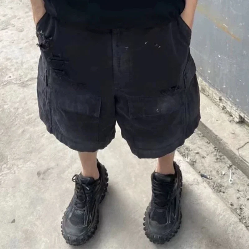 Hearujoy Vintage Ripped Damaged Black Cargo Shorts for Men High Street Wide Leg Baggy Overalls Distressed Summer Knee Length Pants
