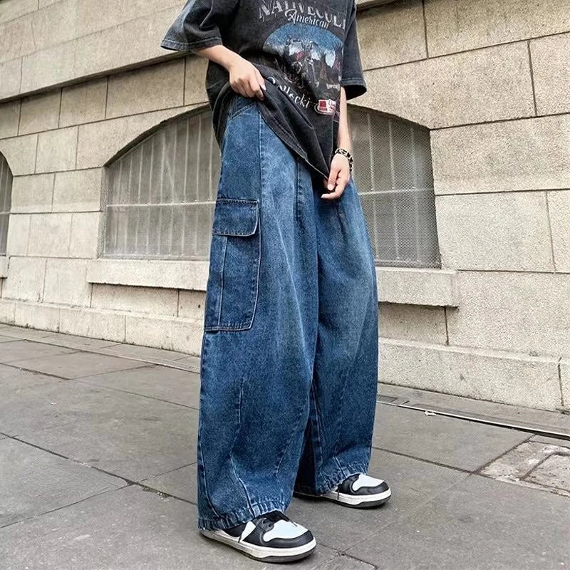 Hearujoy Washed Casual Retro Wide Leg Baggy Jeans Mens All Match Straight Hip Hop Large Pocket Overalls Blue Jeans for Women Streetwear