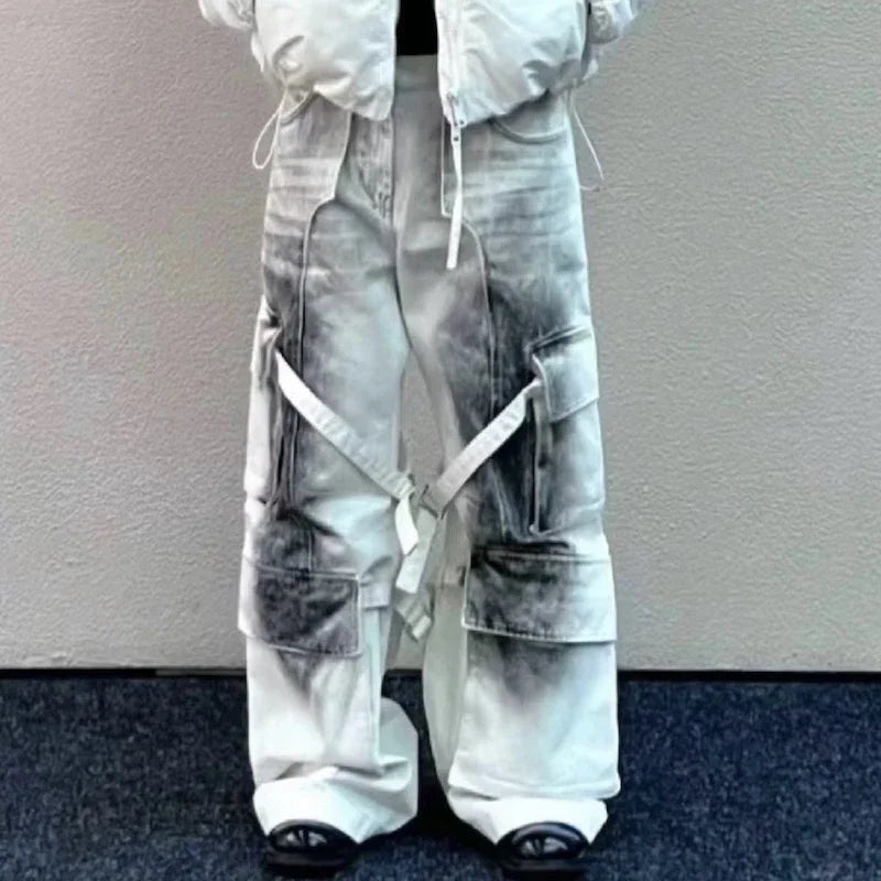 Hearujoy White Splashed Ink Distressed Jeans for Men streetwear Multi-pockets Baggy Cargo Pants Oversize Ropa Hombre Loose Denim Trousers