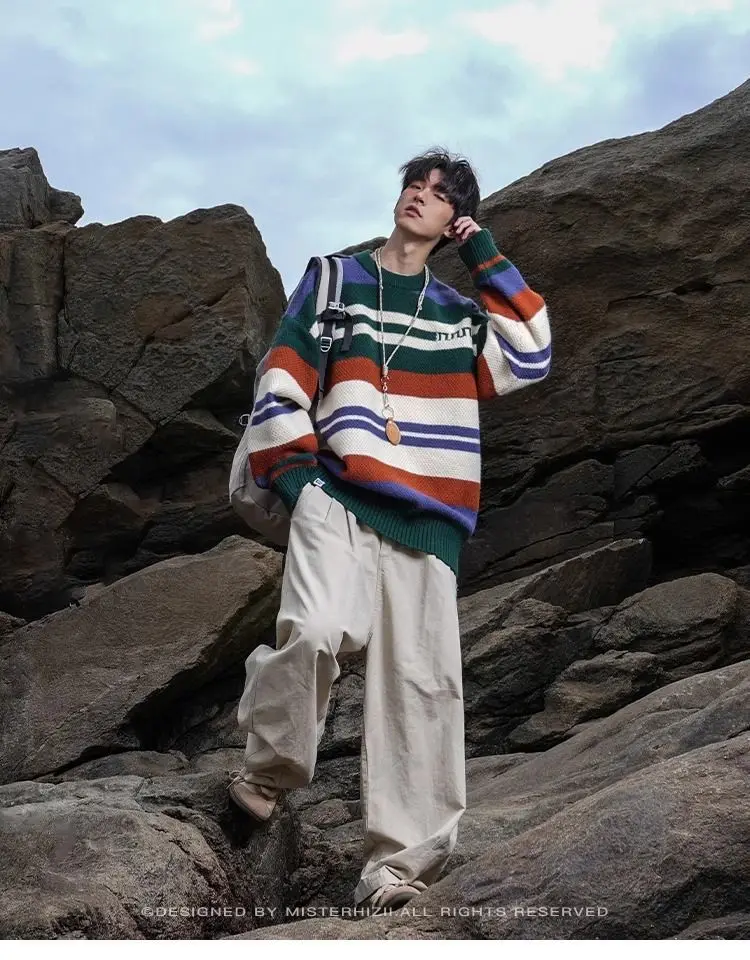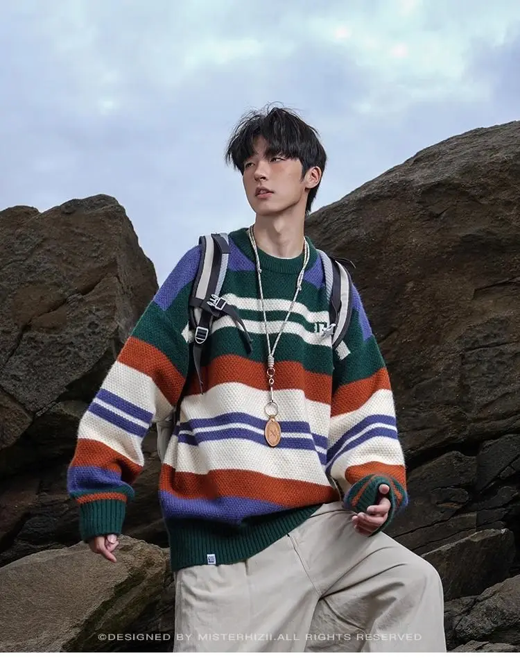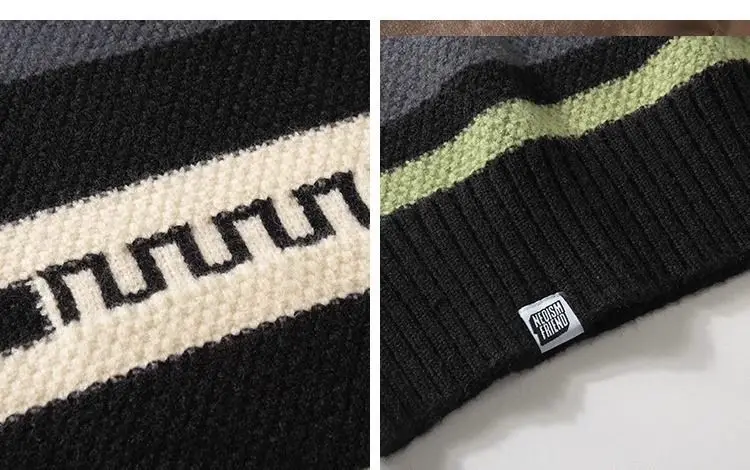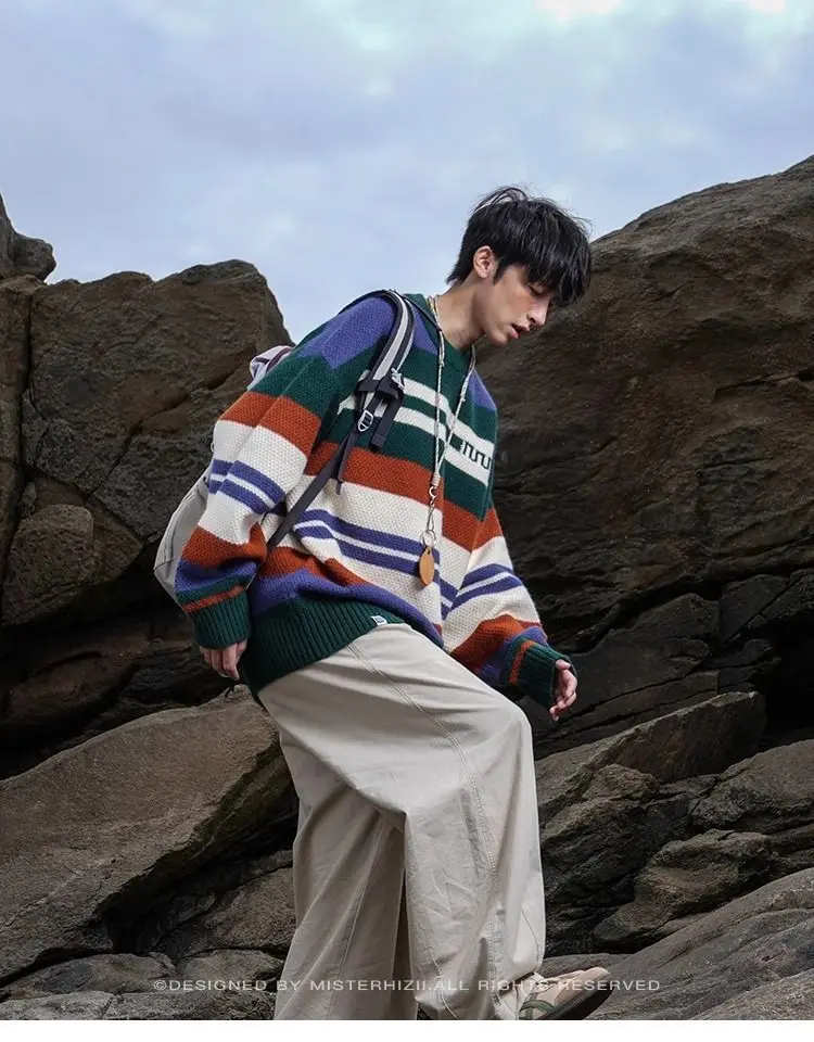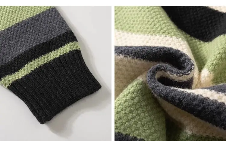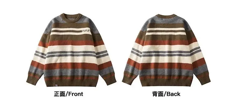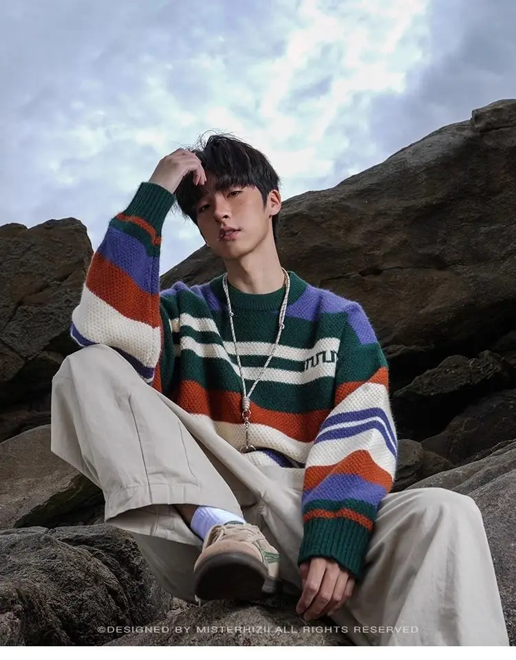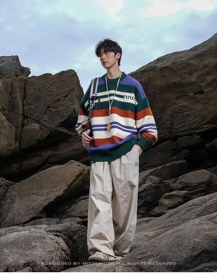 Hearujoy Winter Men's Retro O-neck Sweater with Contrasting Stripes Casual Loose Pullover Sweater for Teenagers Preppy Striped Cardigan