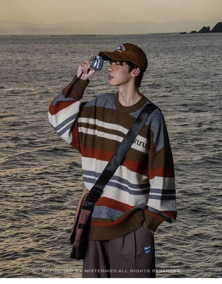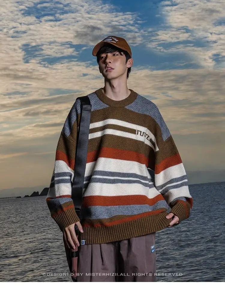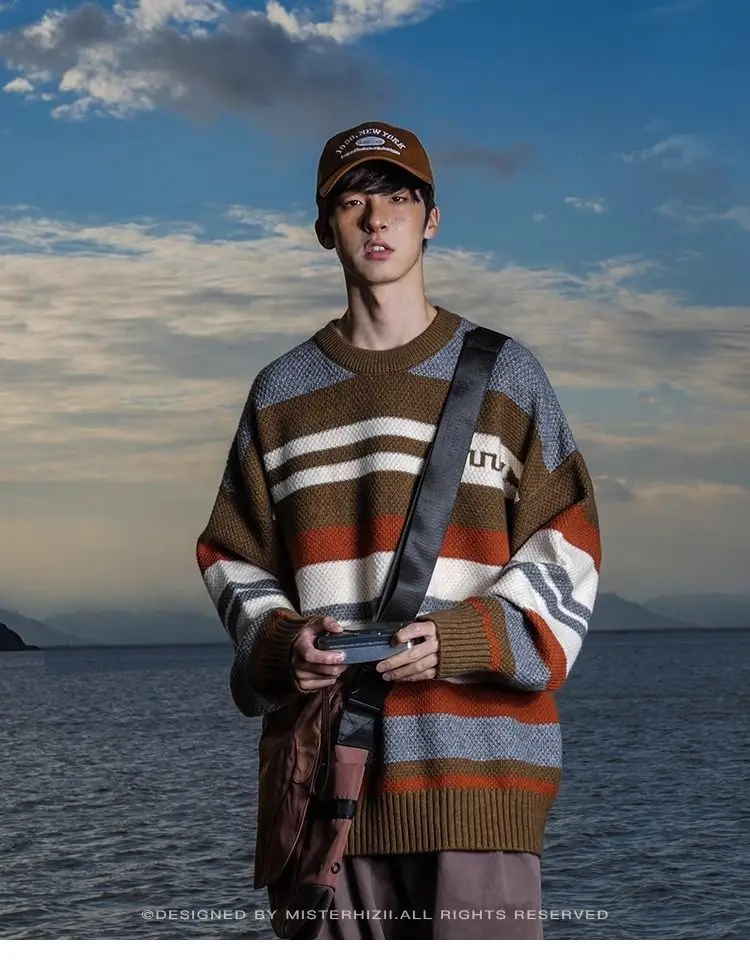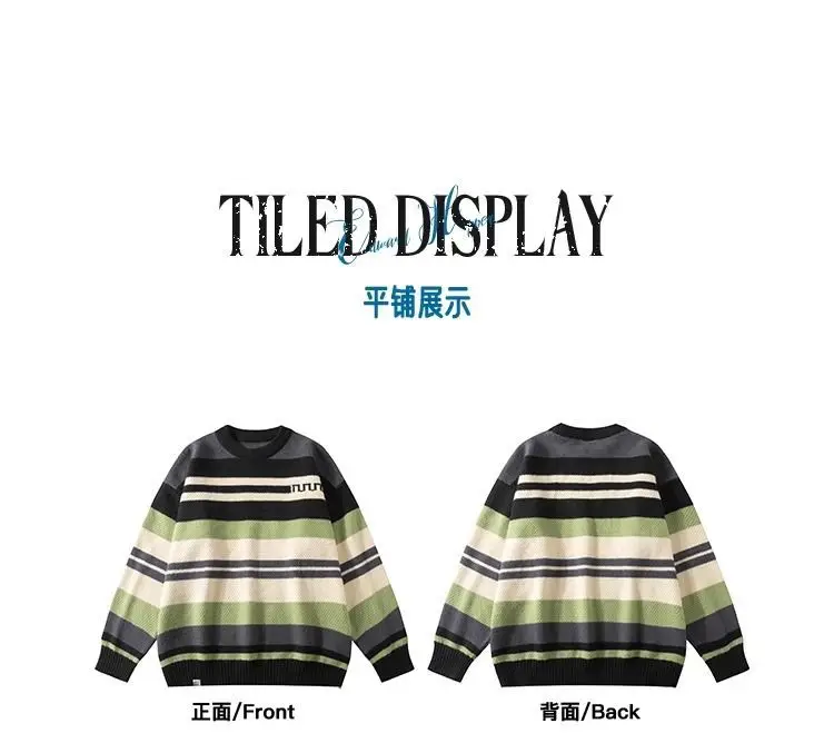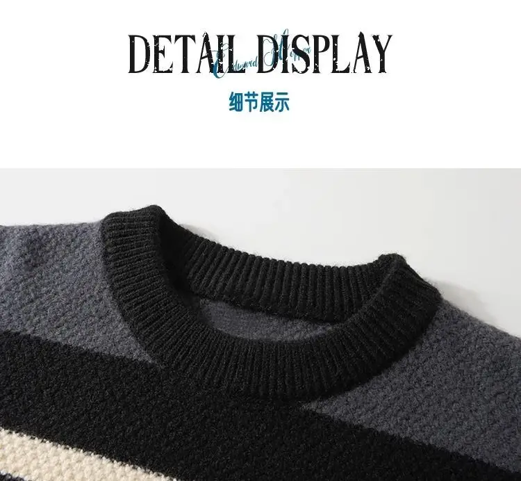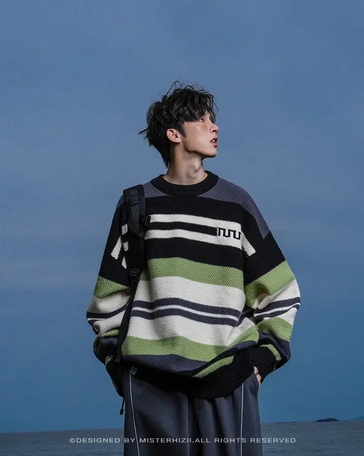 Hearujoy Winter Men's Retro O-neck Sweater with Contrasting Stripes Casual Loose Pullover Sweater for Teenagers Preppy Striped Cardigan