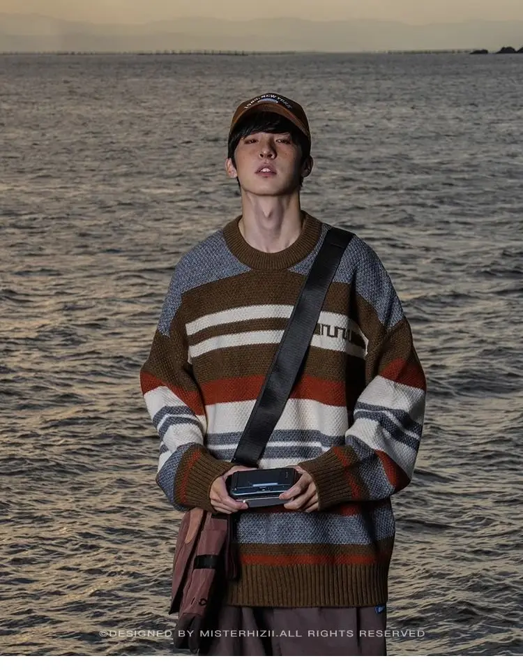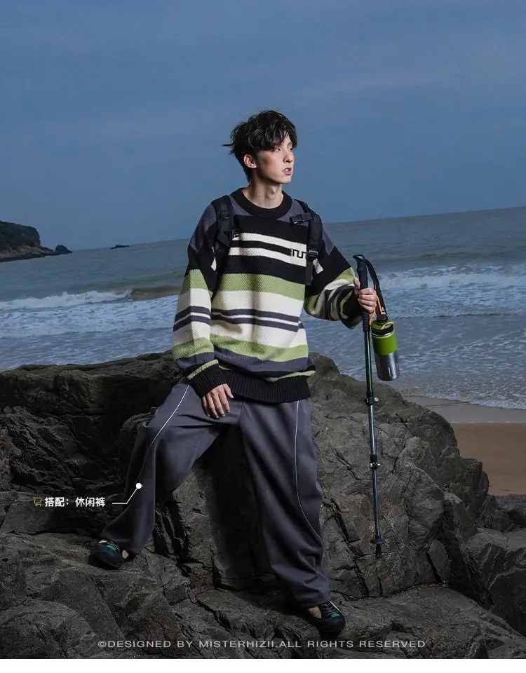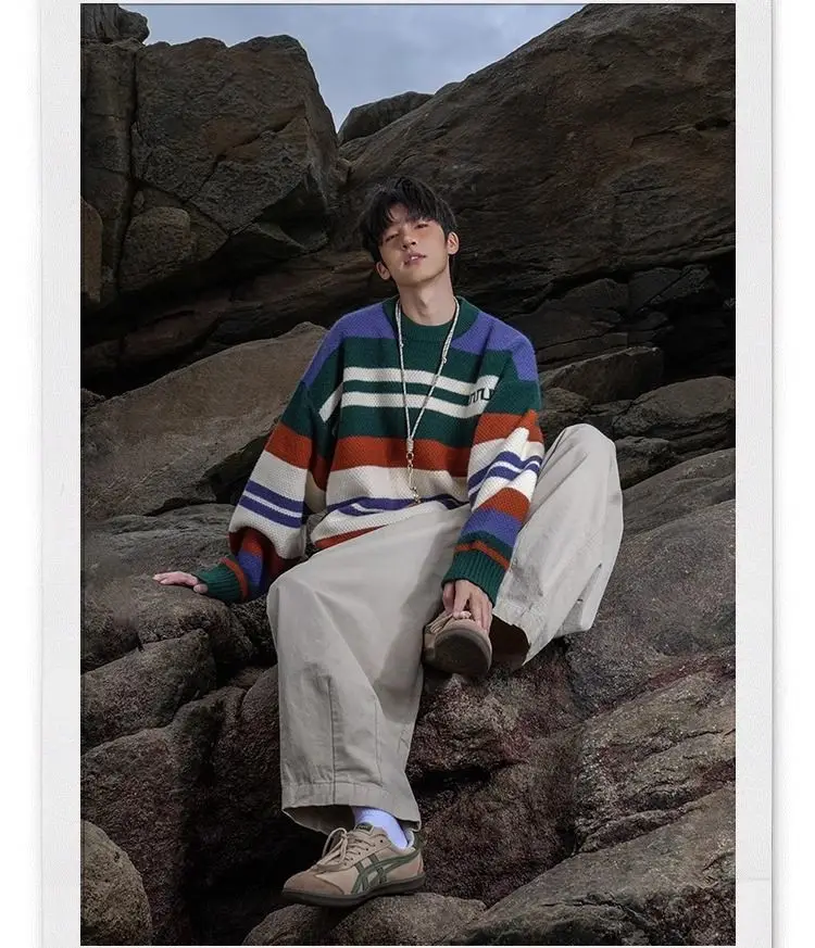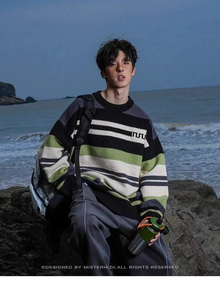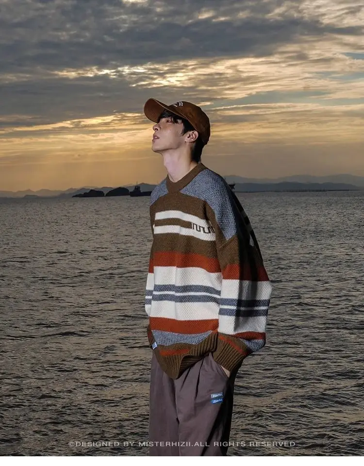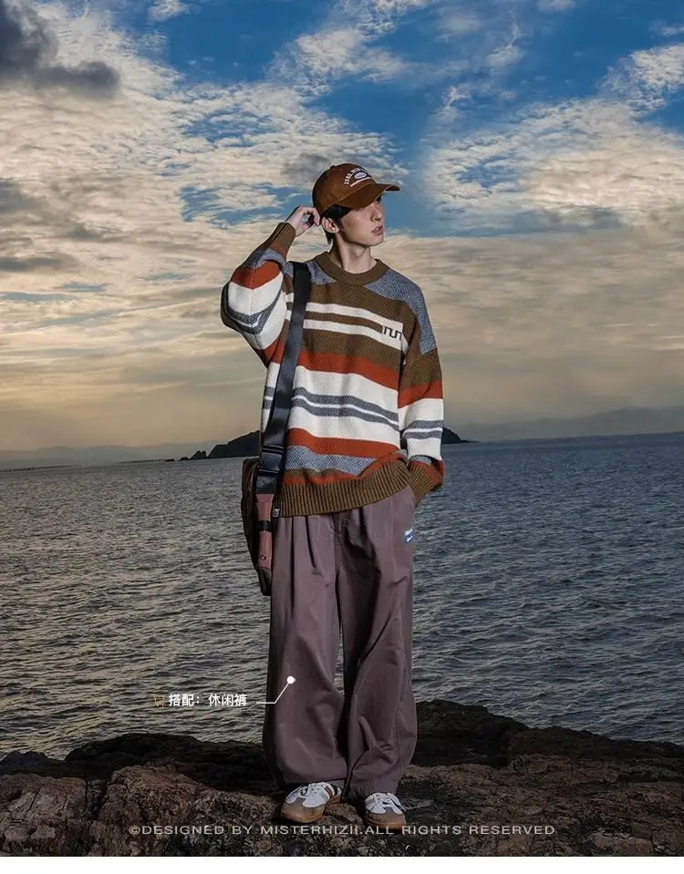 Hearujoy Winter Men's Retro O-neck Sweater with Contrasting Stripes Casual Loose Pullover Sweater for Teenagers Preppy Striped Cardigan