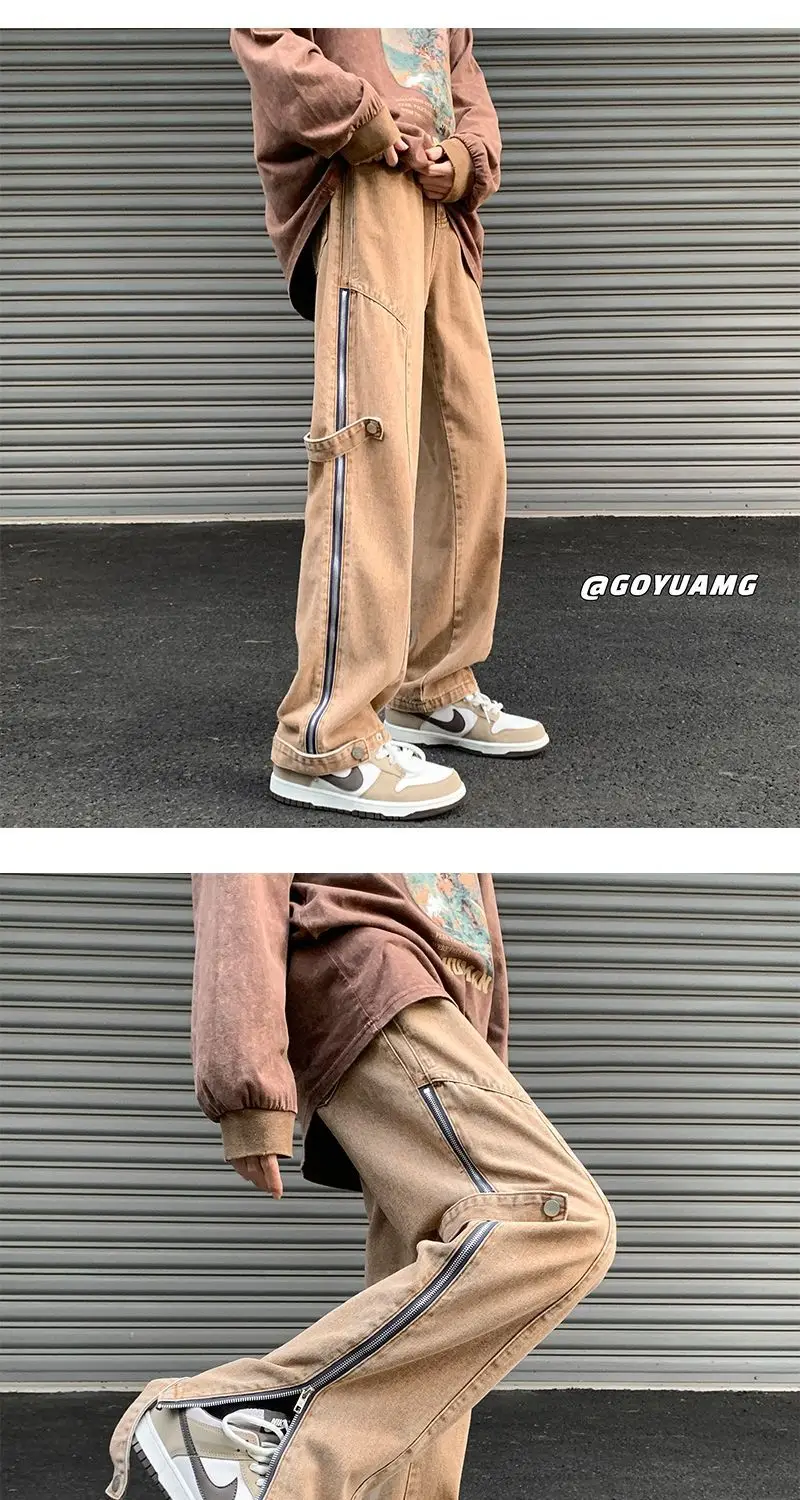 Hearujoy Y2K American High Street Stitching Side Zipper Split Jeans Men Retro Loose Trend Joker Handsome Straight Design Casual Pants