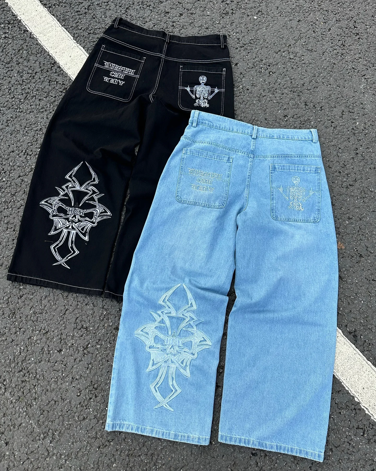 Y2K Retro Cross Skull Embroidery Baggy Jeans America Gothic Straight Wide Leg Denim Pants Men Women Fashion Streetwear Jogger