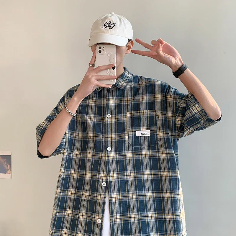 HEARUJOY - Y2k Streetwear Plaid Men Shirts New Summer Fashion Chemise Homme Fashion Mens Checkered Shirts Short Sleeve Men Blouse