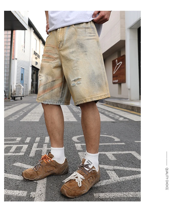 HEARUJOY - Yellow mud-dyed, washed and worn-out holes straight denim cropped pants. Retro men's summer straight thin shorts are fashionable